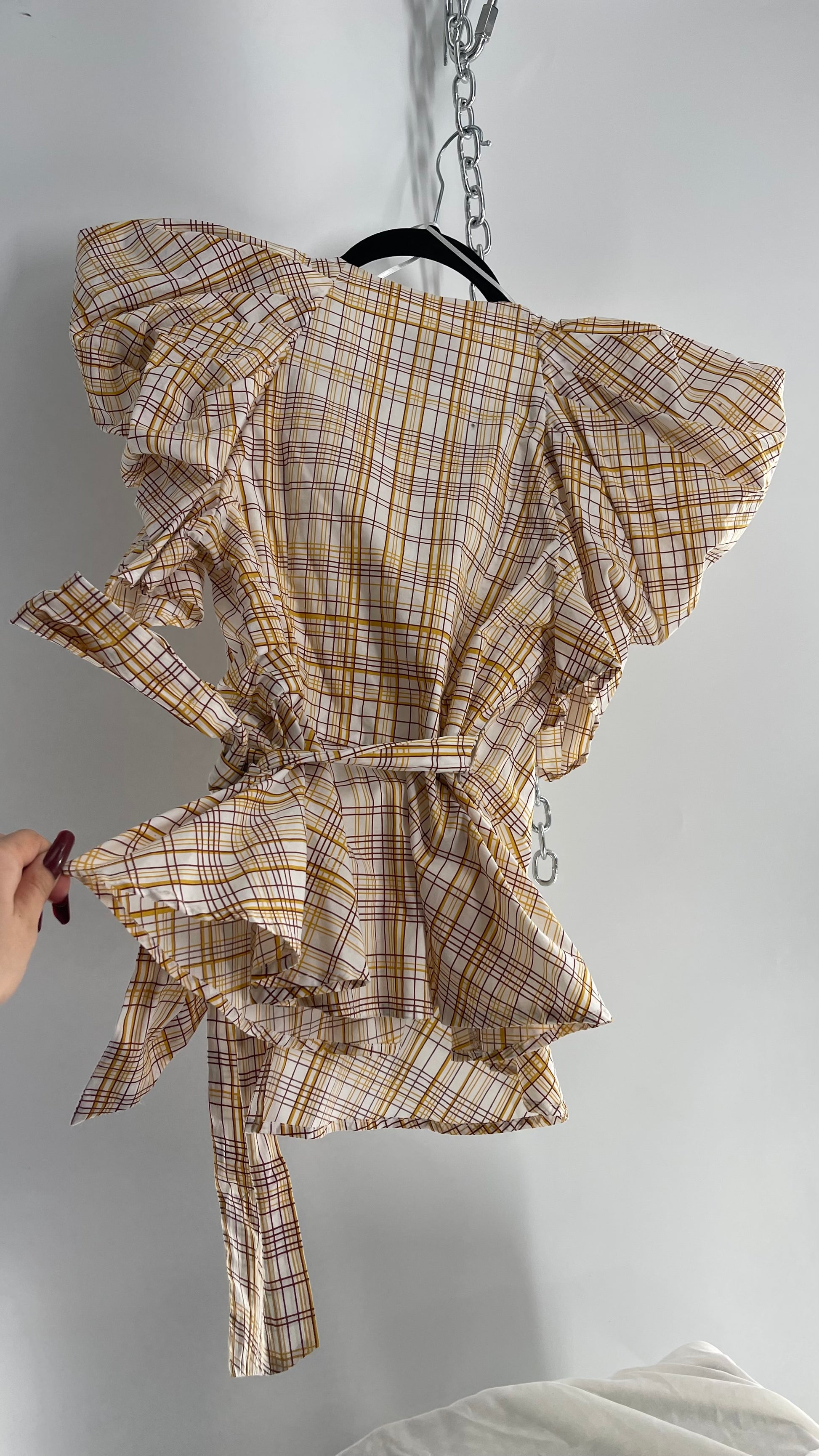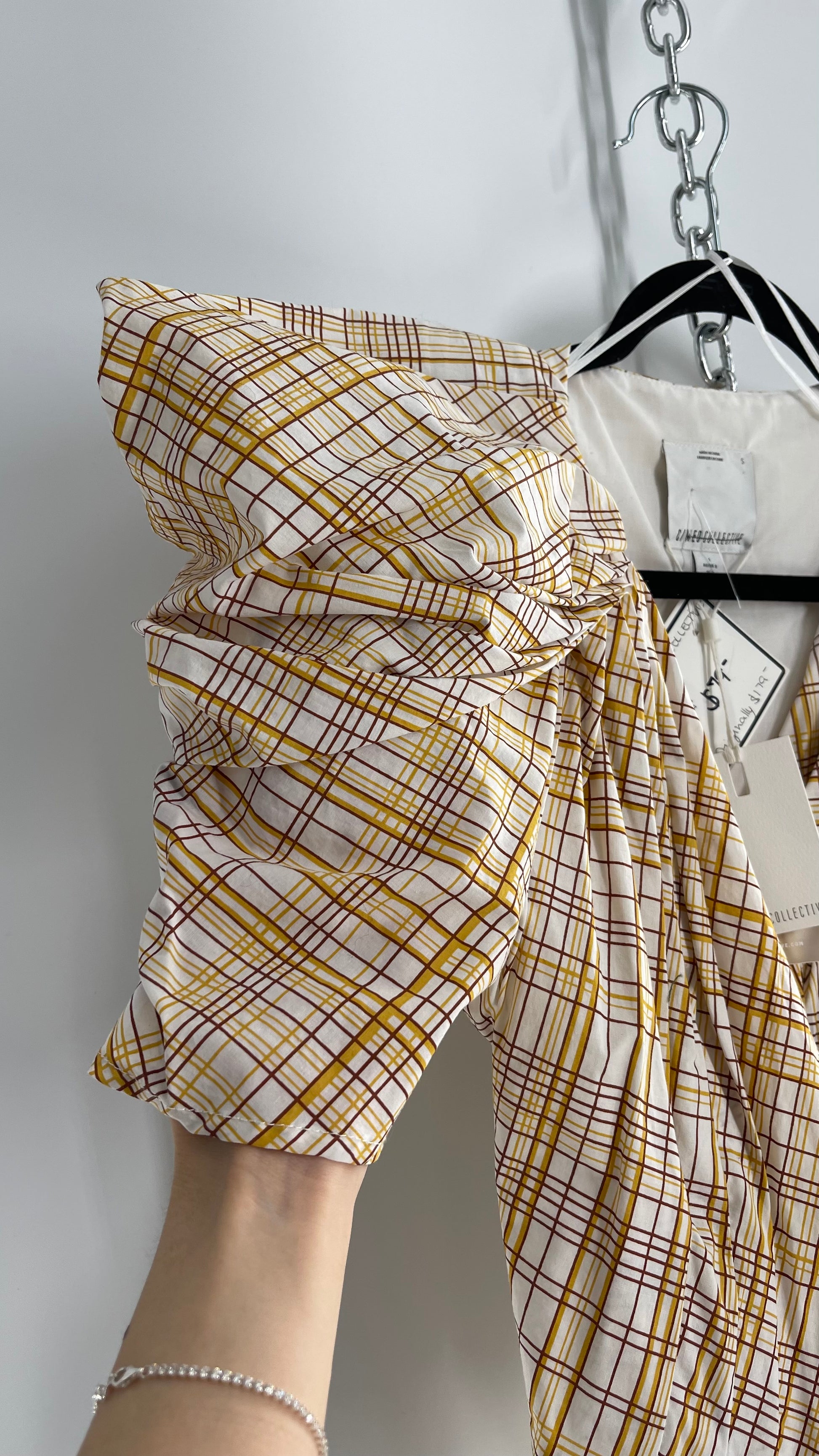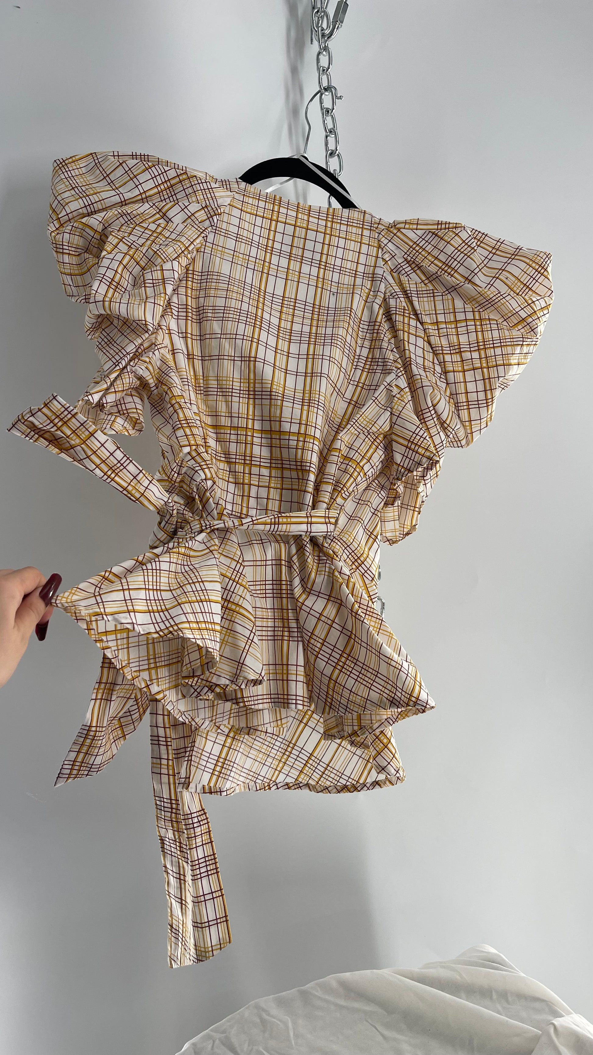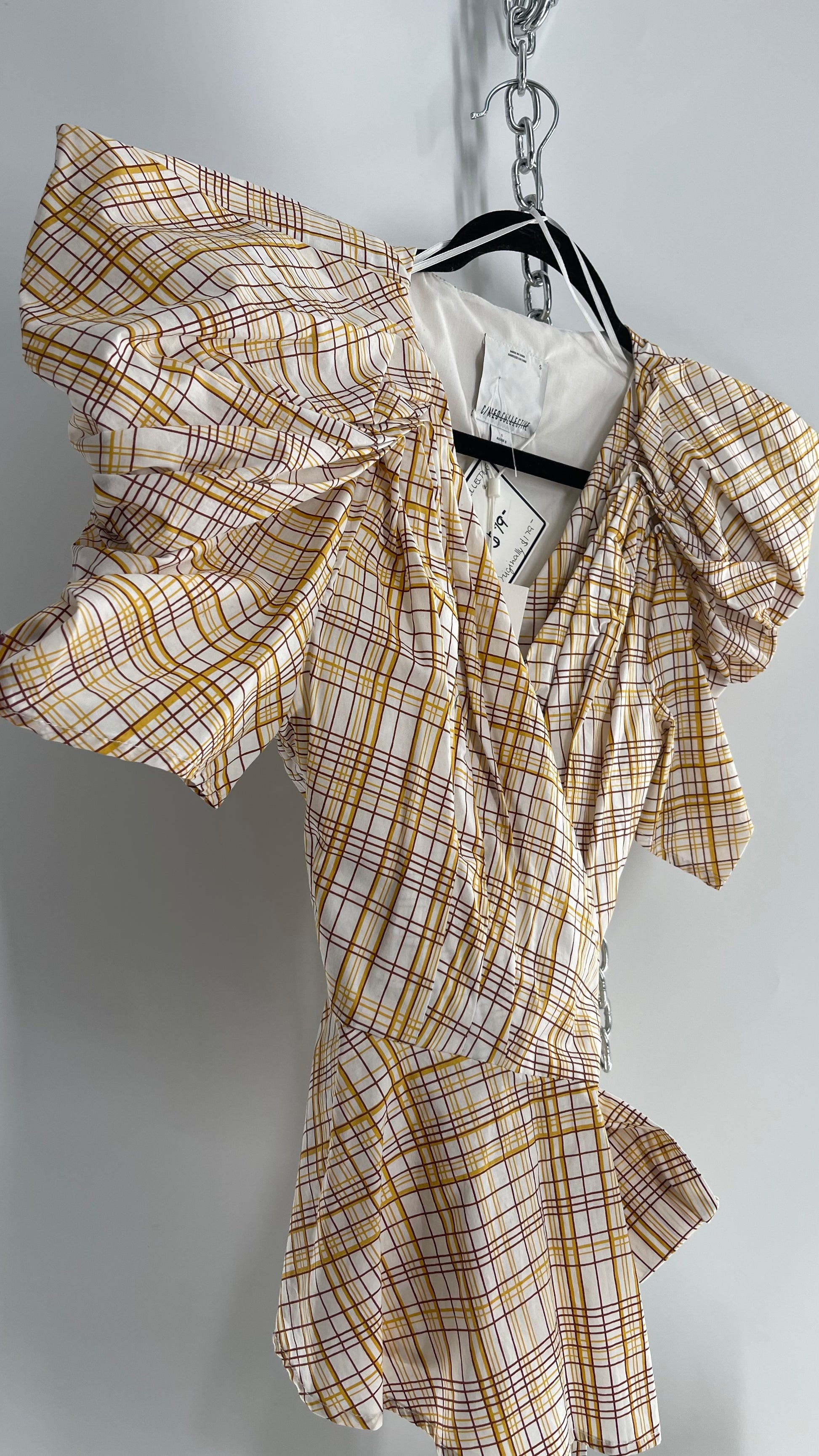 Anthropologie NWT C/MEO COLLECTIVE peplum top with puff sleeves, pleated bust, wrap around detail and yellow/brown plaid pattern