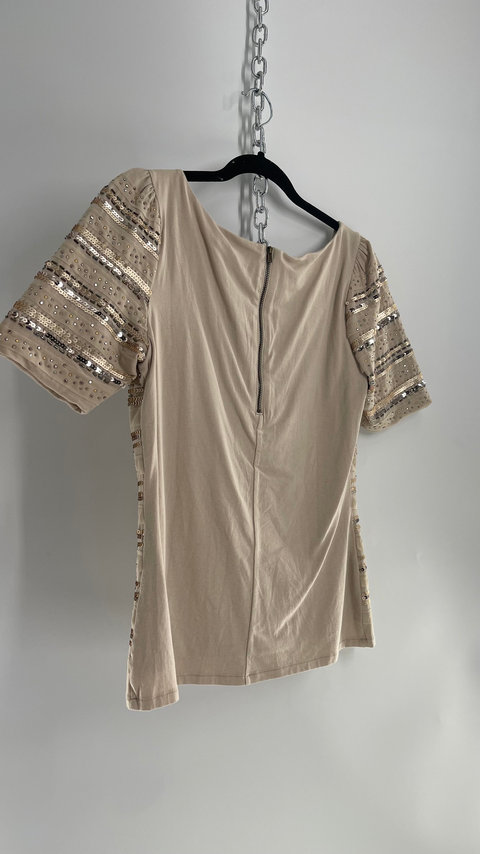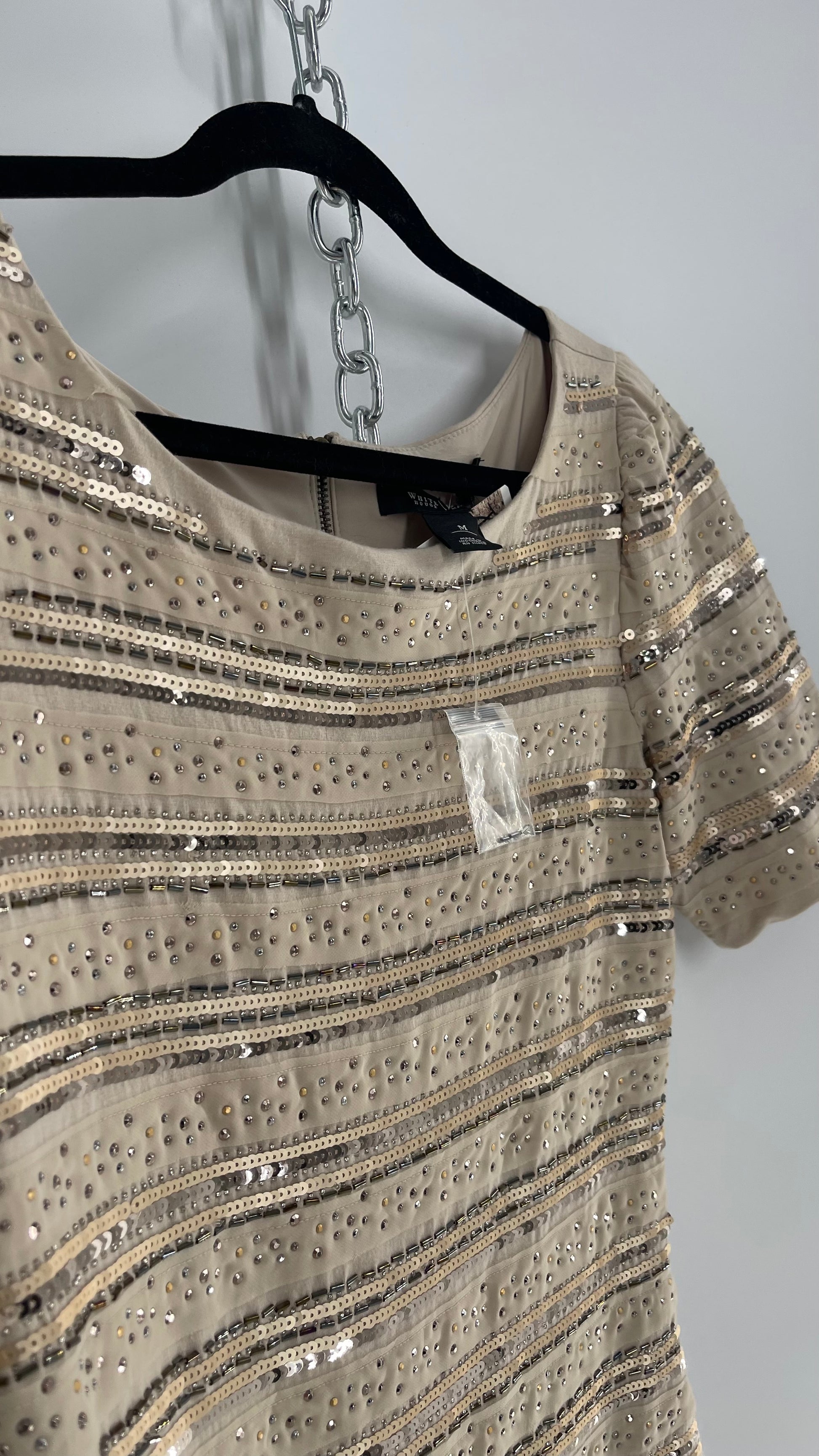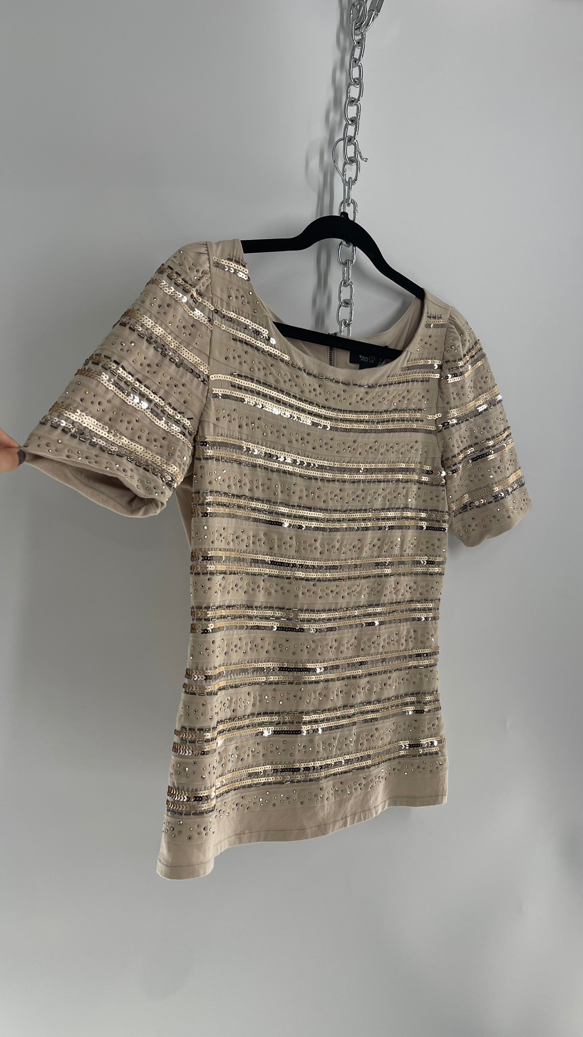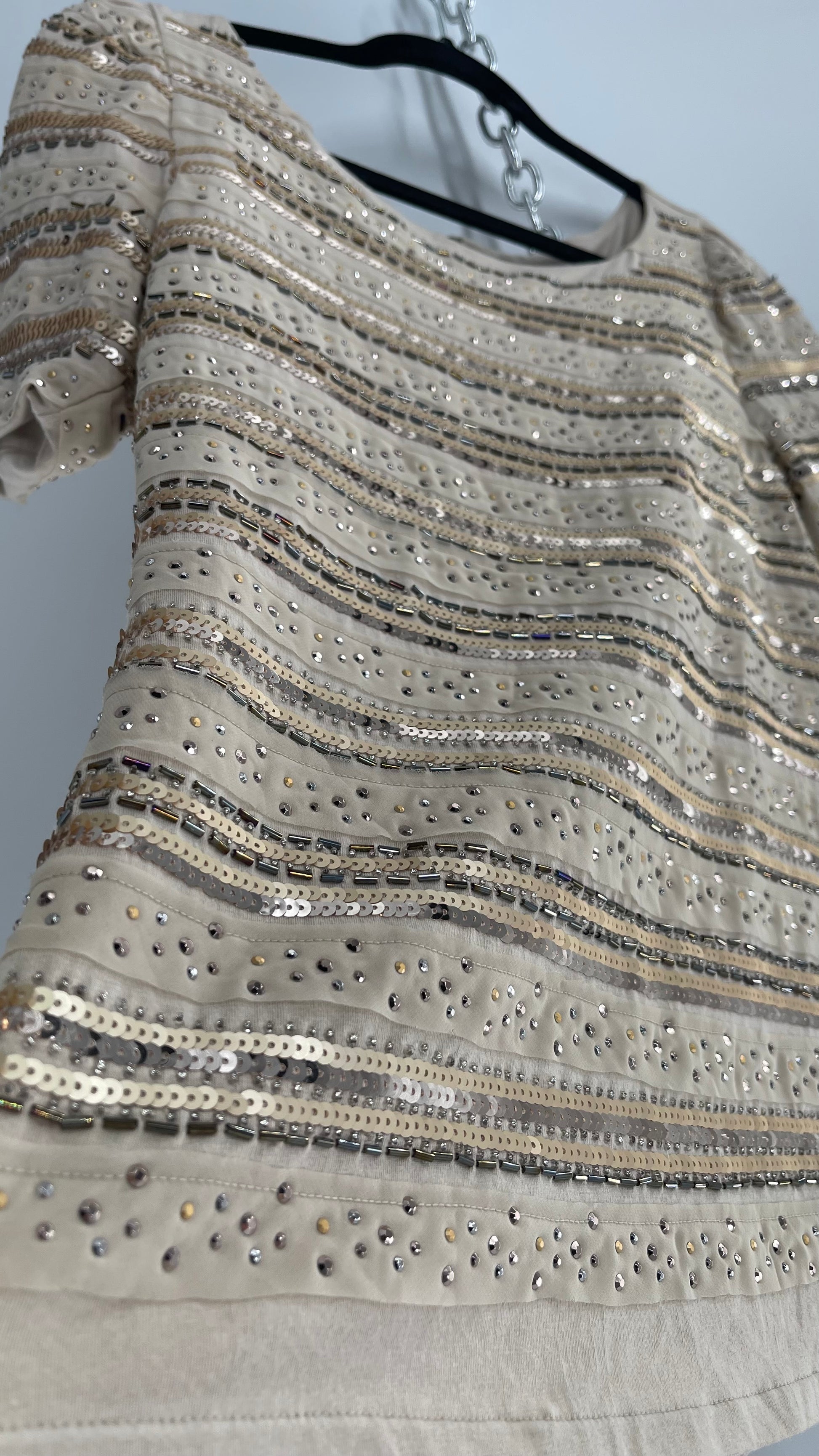 White House| Black Market Bedazzled and Beaded Beige T Shirt (Medium)