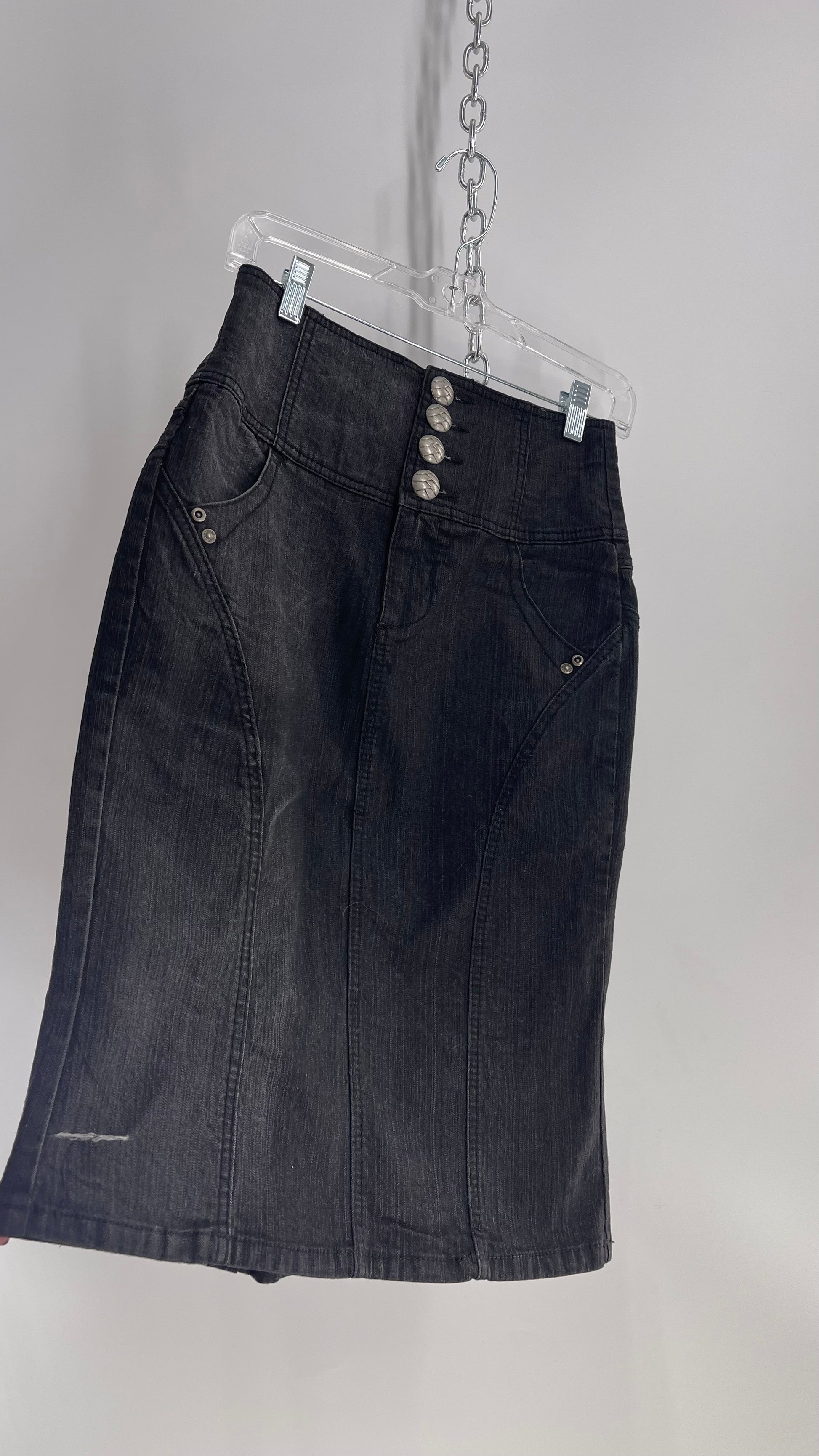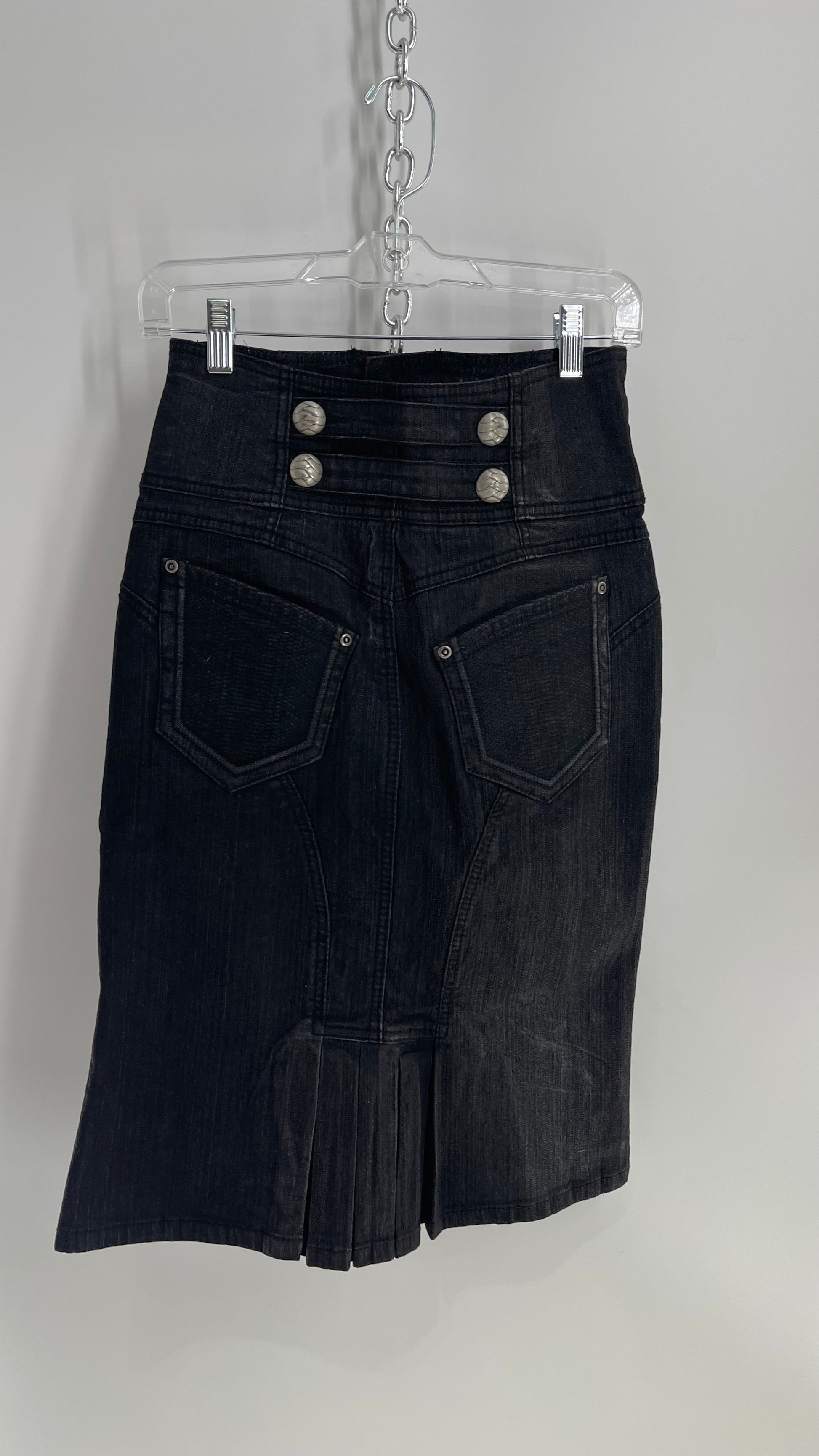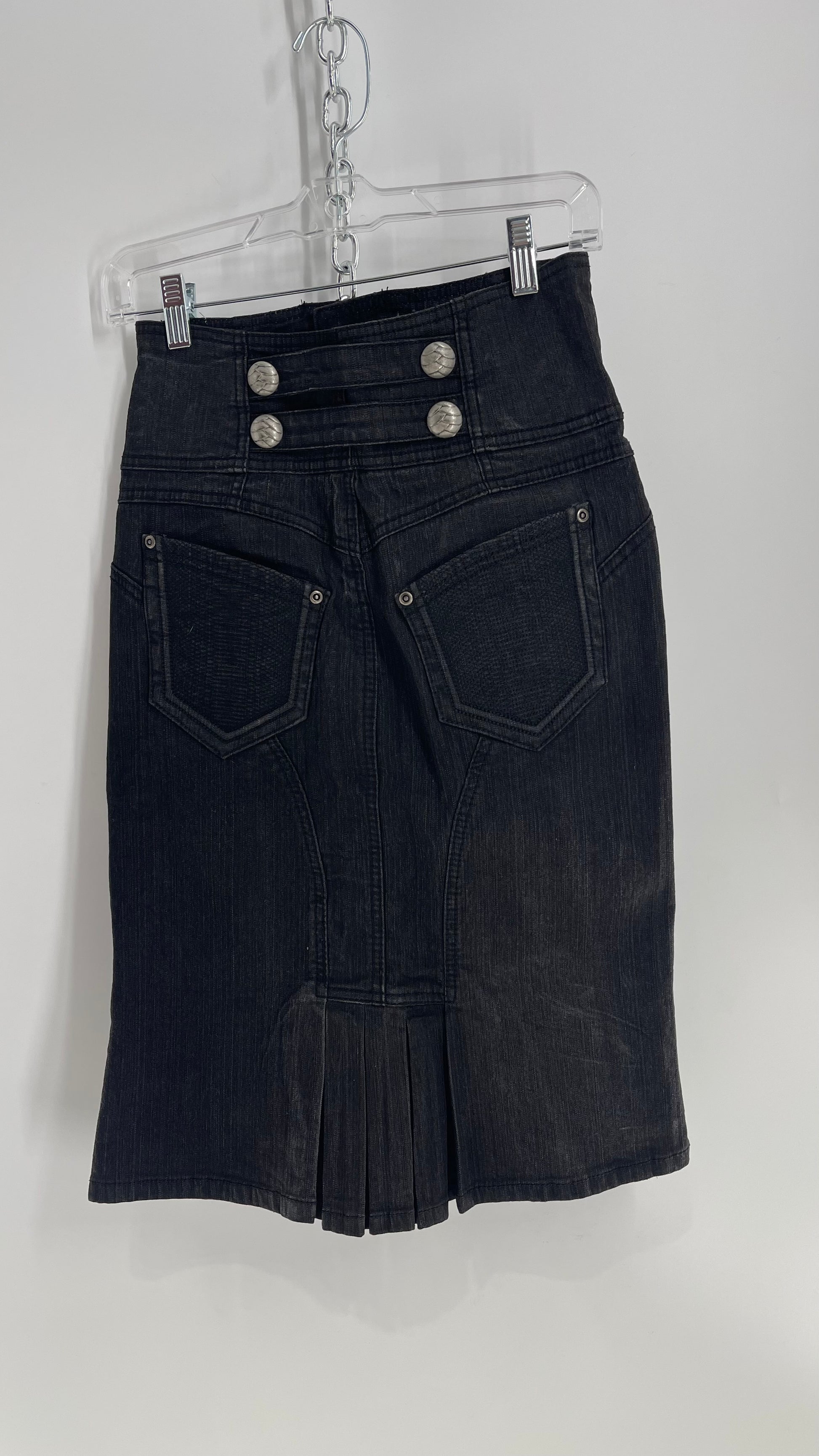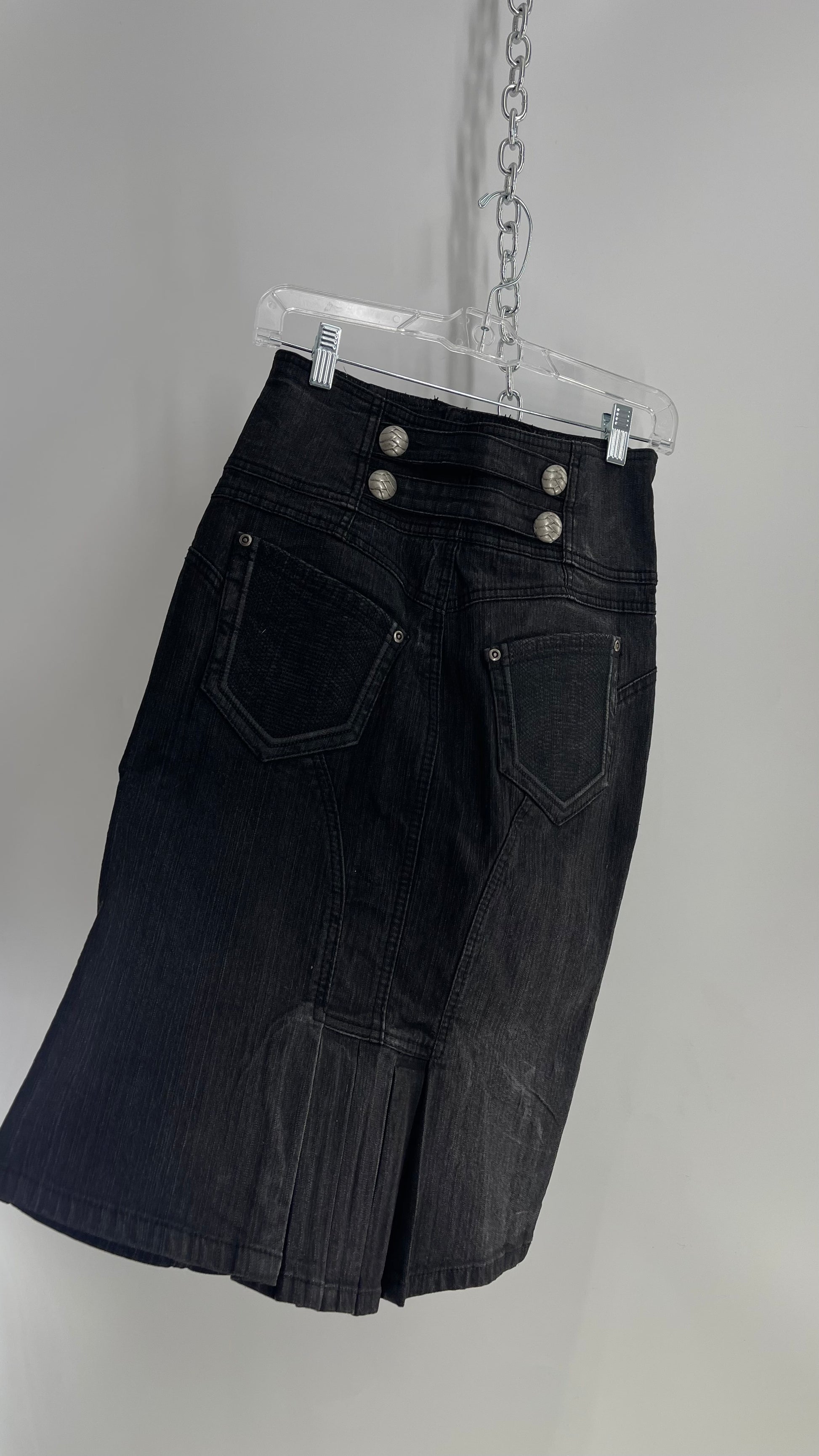 XOXO Dark Wash Denim Body Con Midi Skirt with Buttons, Embroidery, and Pleats (7/8)