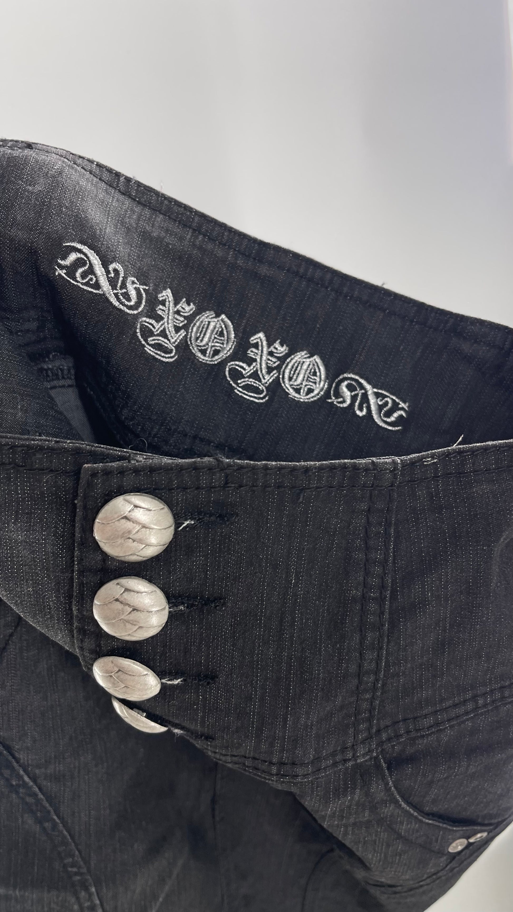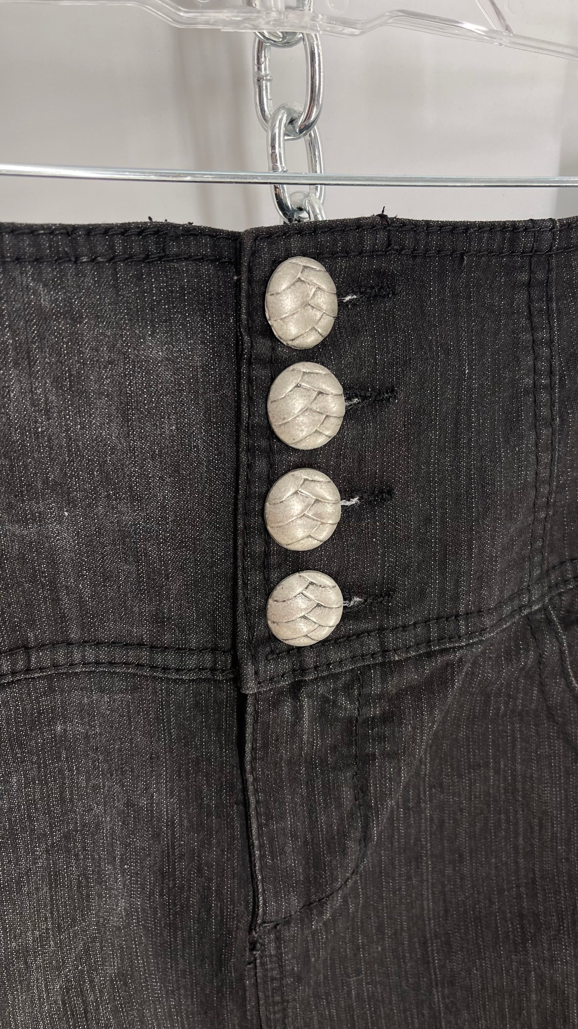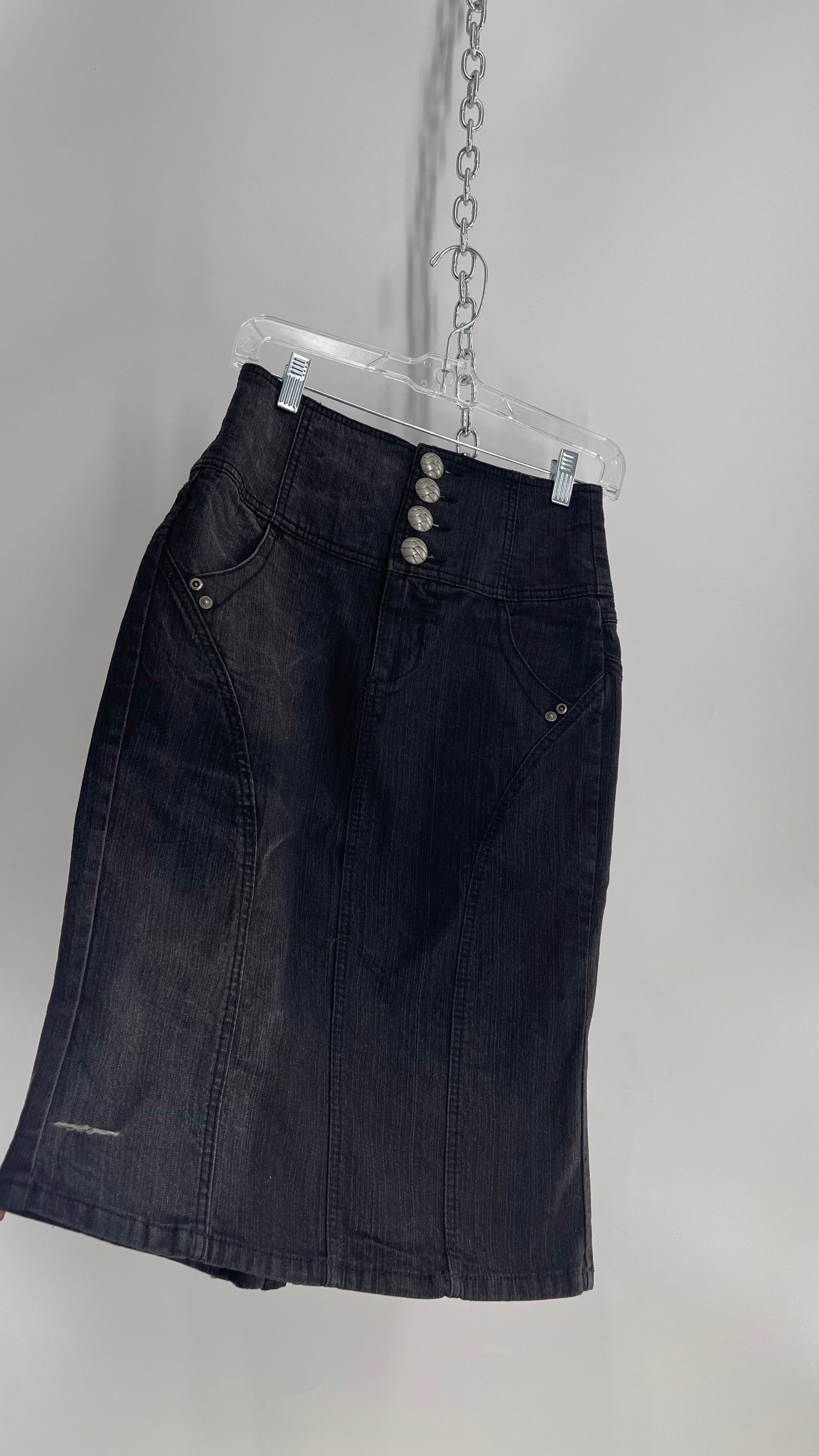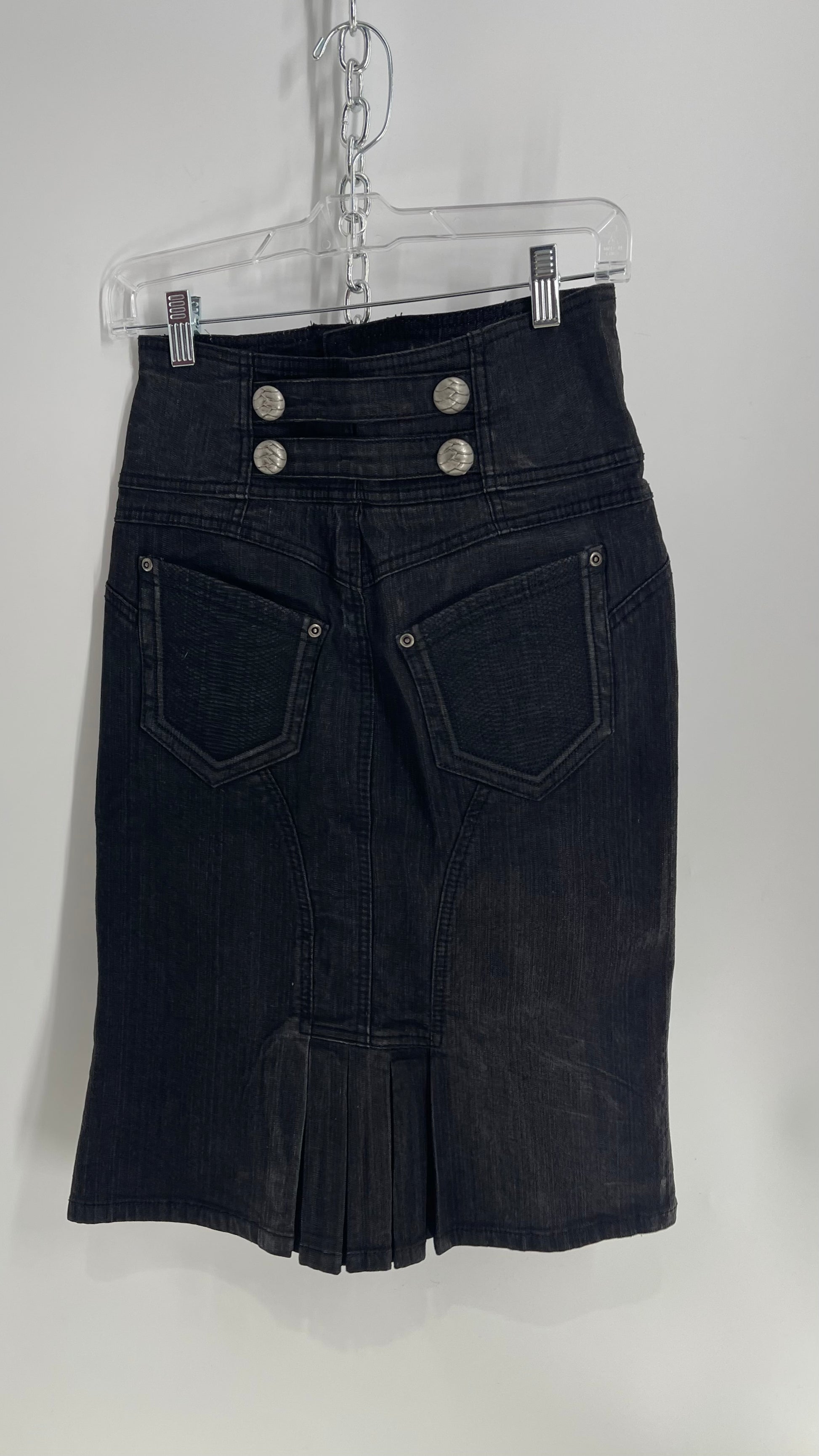 XOXO Dark Wash Denim Body Con Midi Skirt with Buttons, Embroidery, and Pleats (7/8)