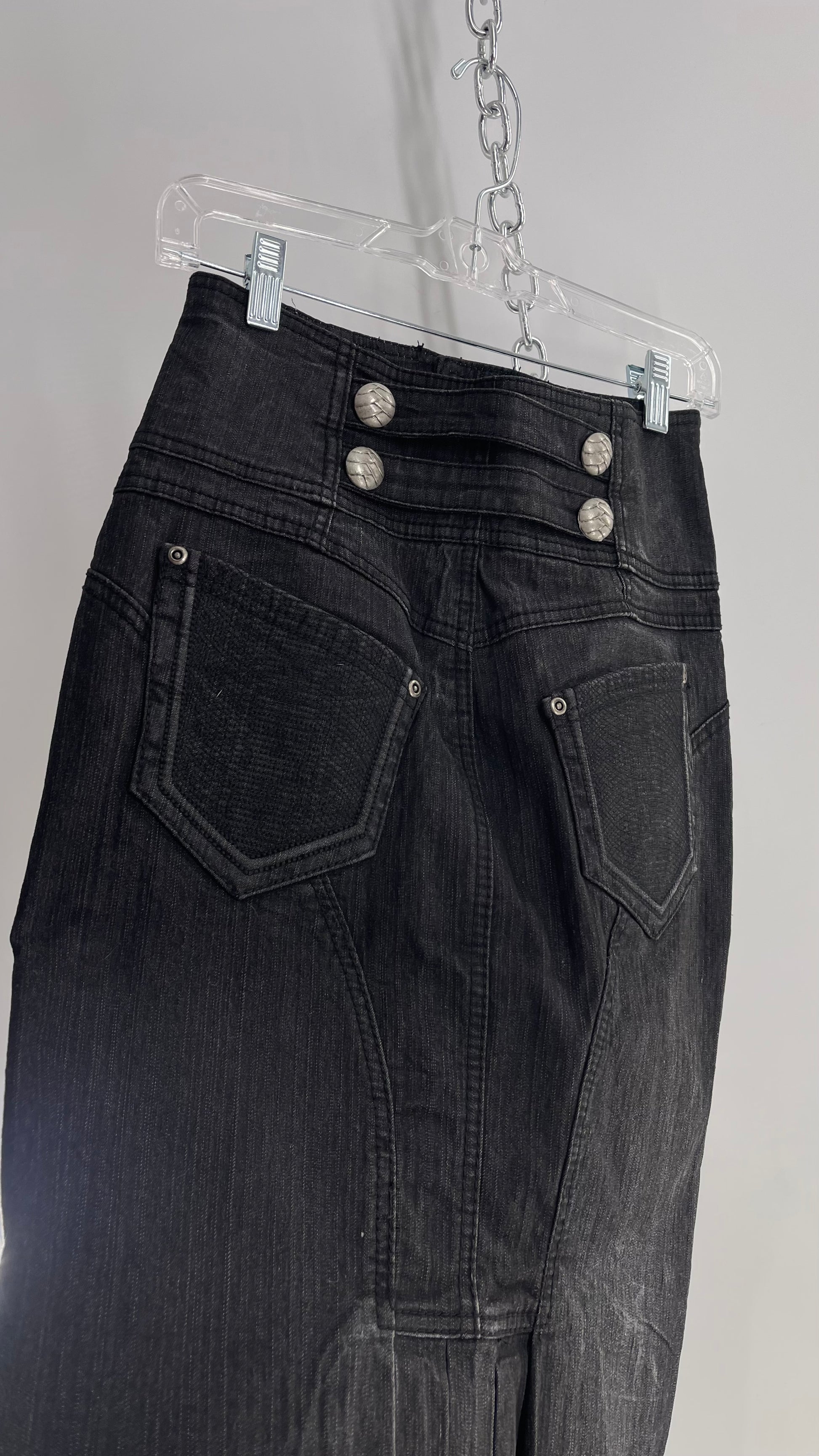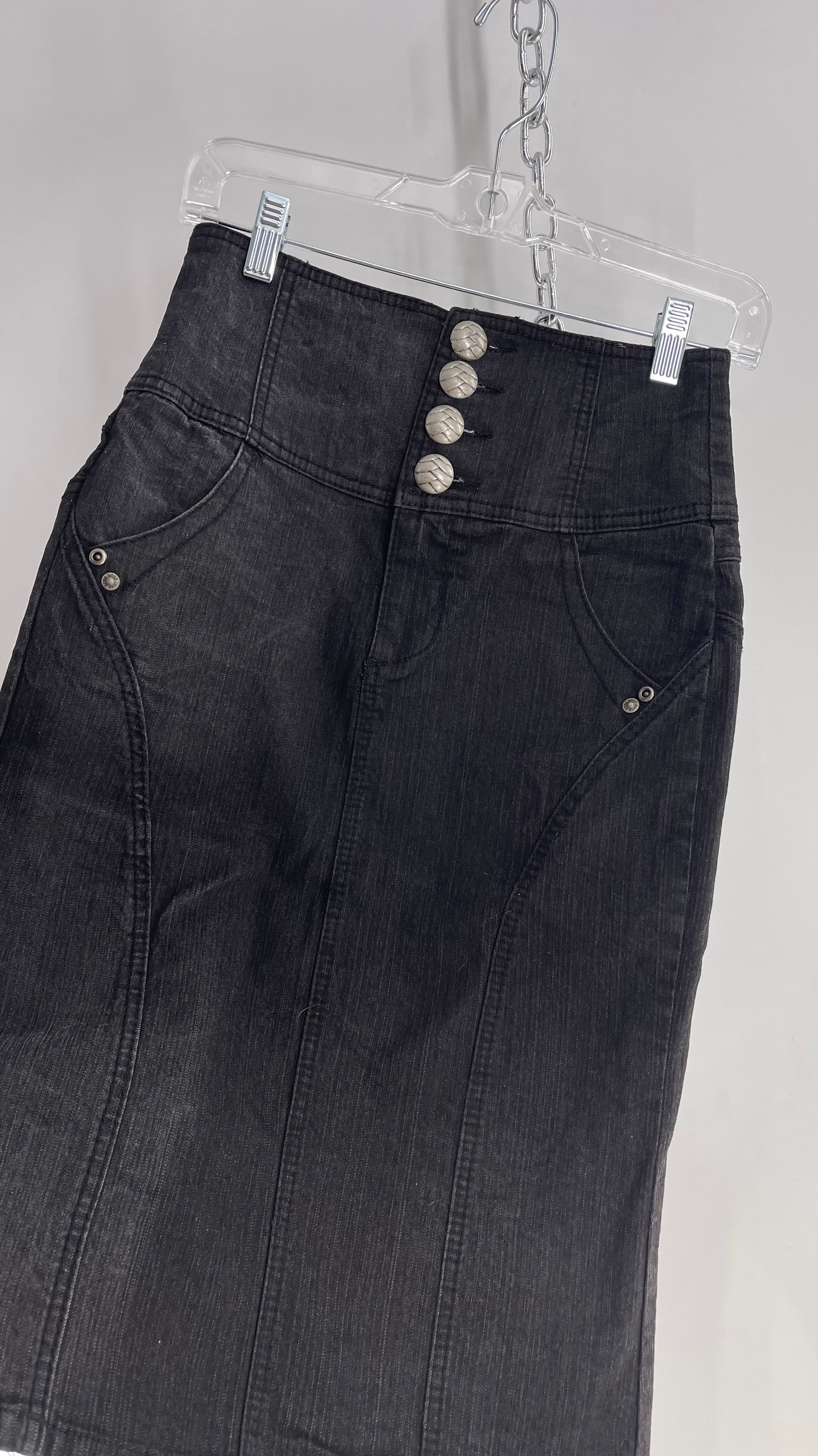 XOXO Dark Wash Denim Body Con Midi Skirt with Buttons, Embroidery, and Pleats