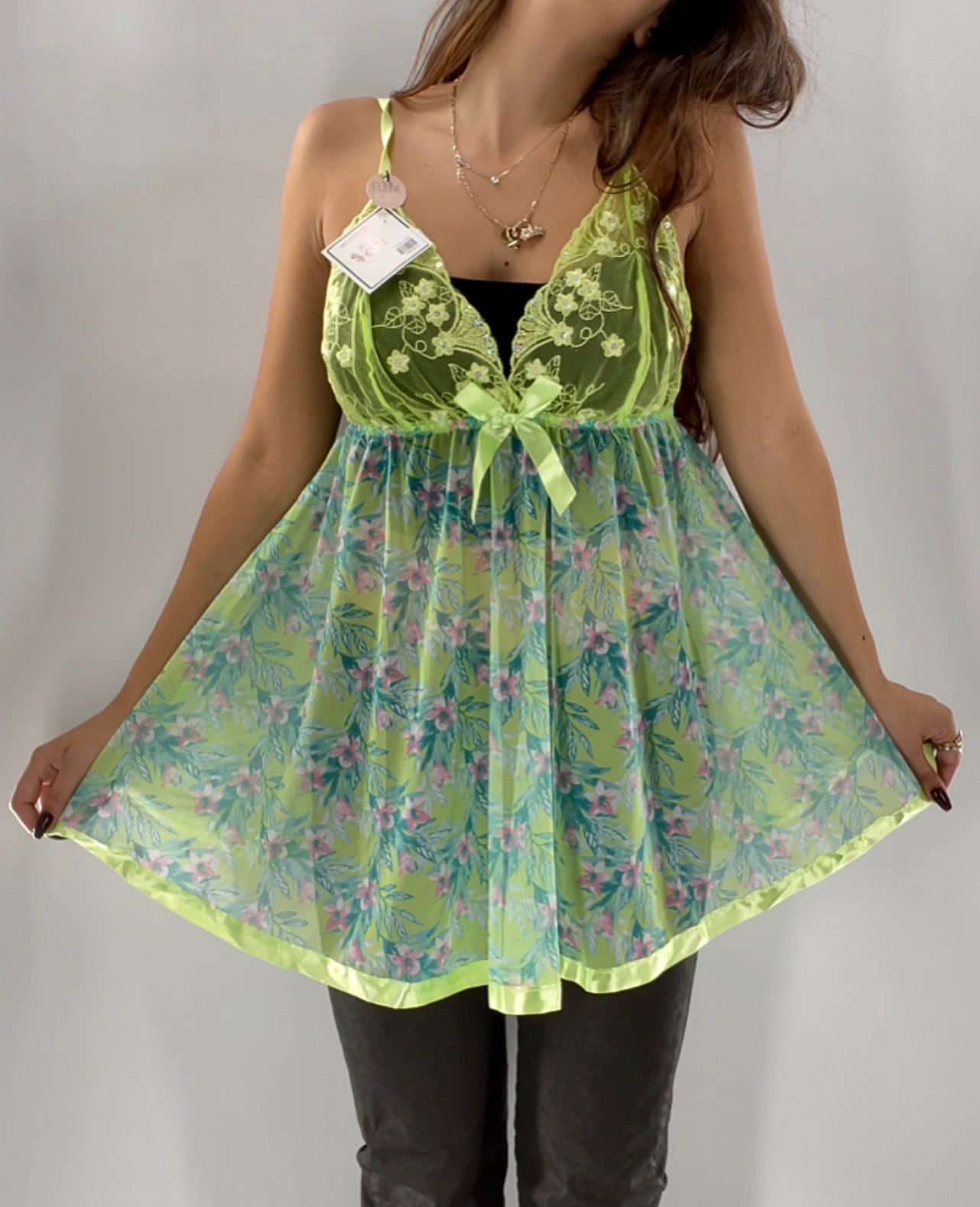 Lime green babydoll set with lace + sequin cups, mesh bodice and thong