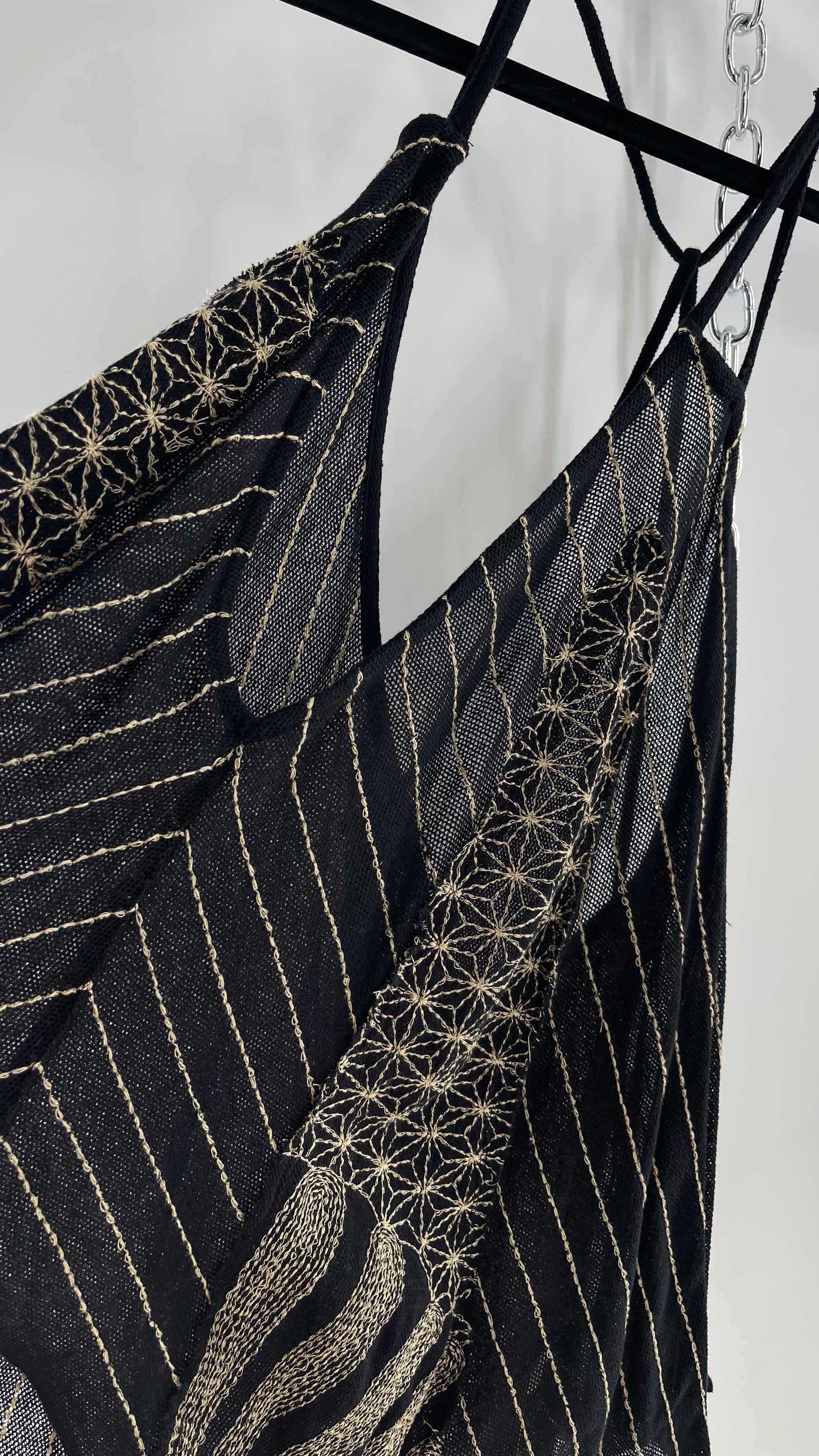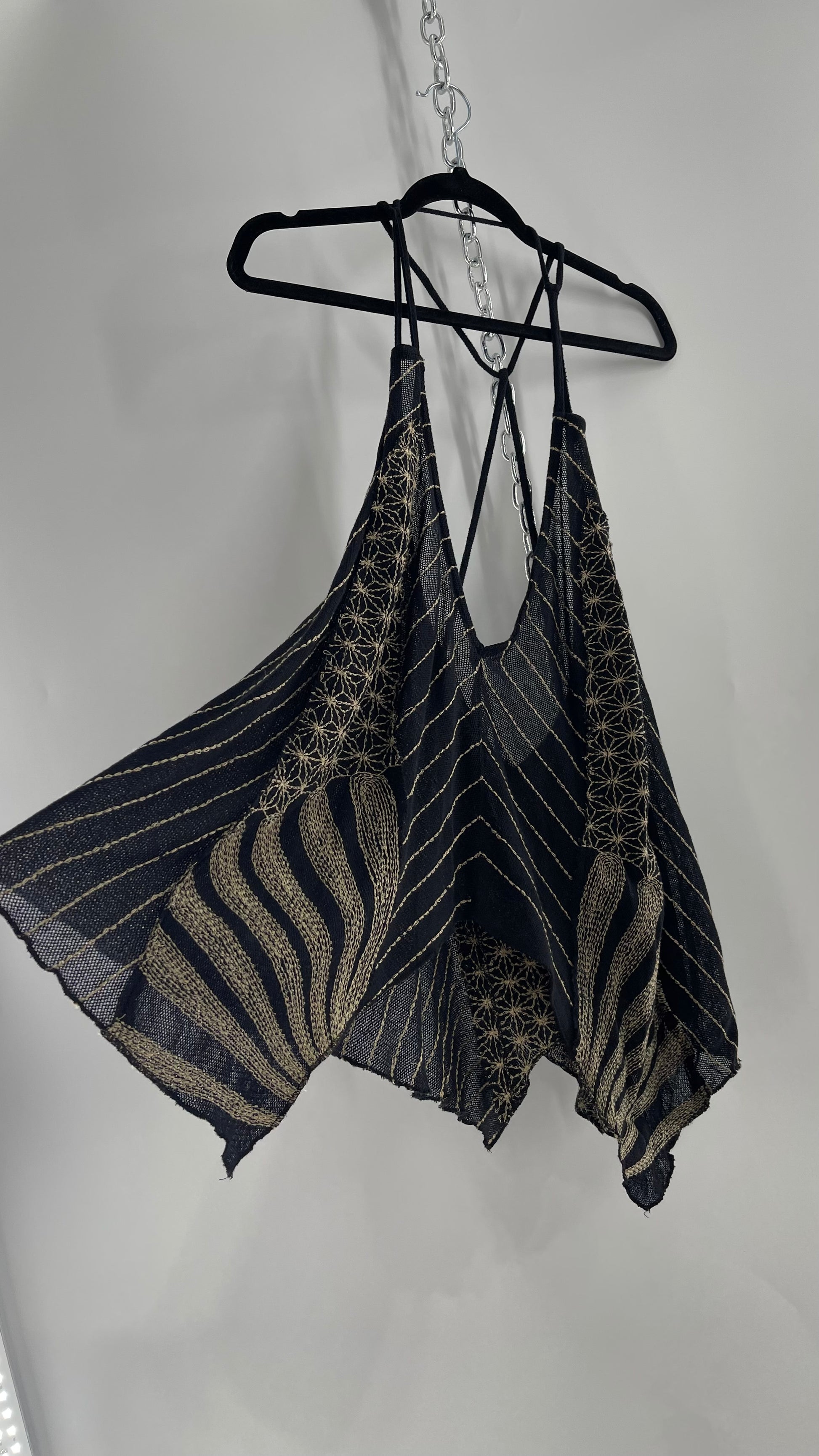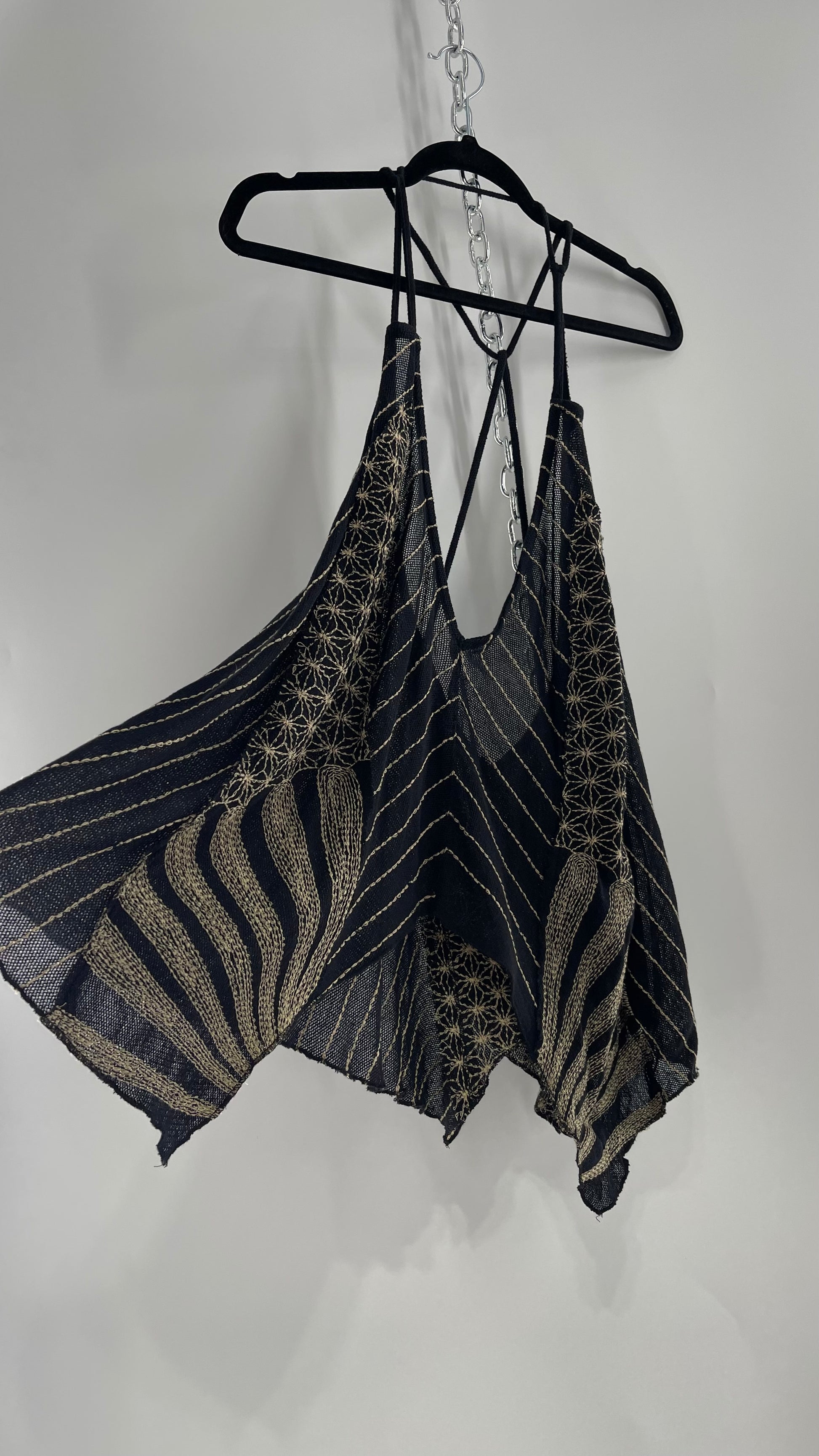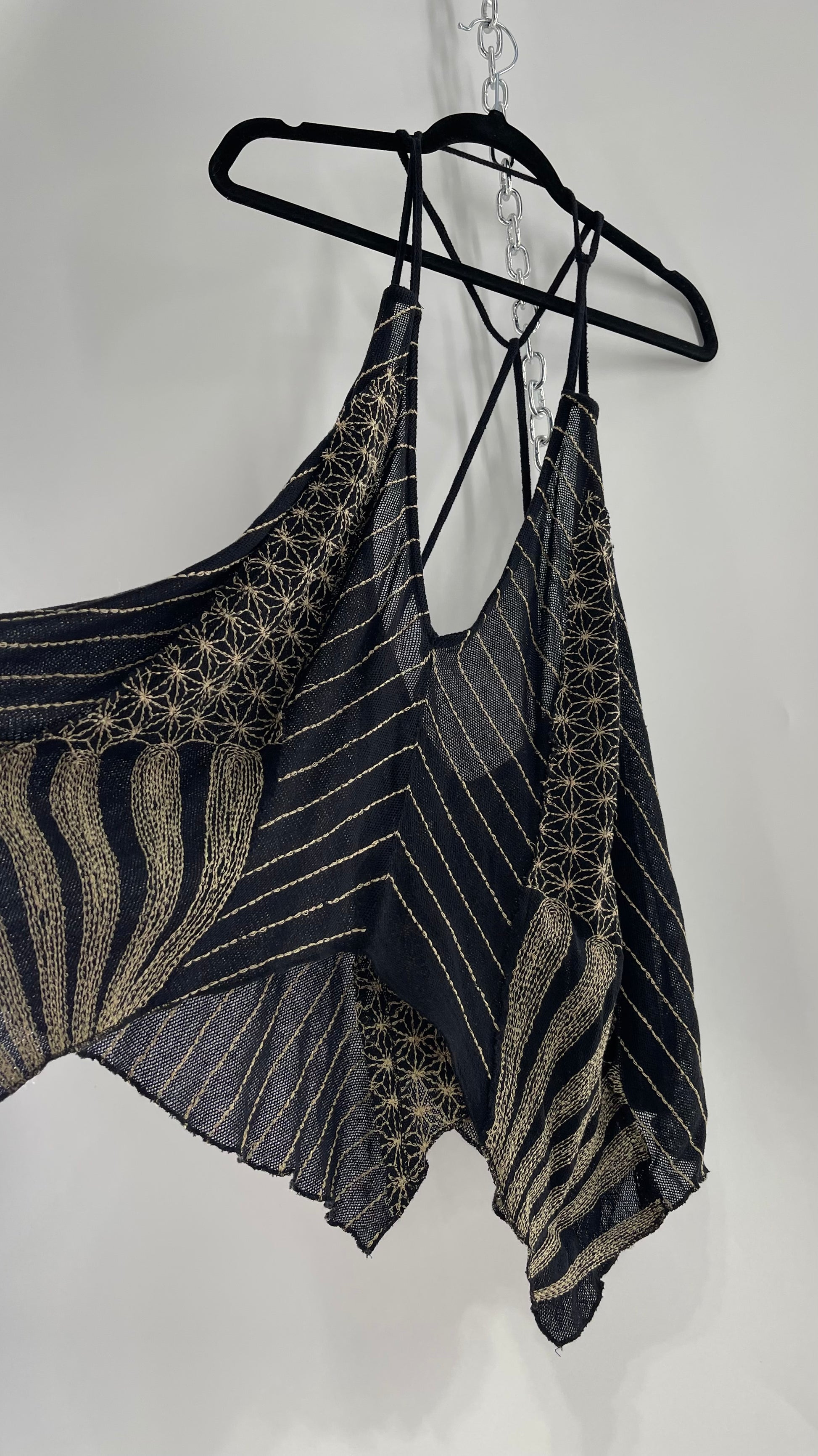 Free People Black Flowy Tank with Tan Embroidery Design (Small)