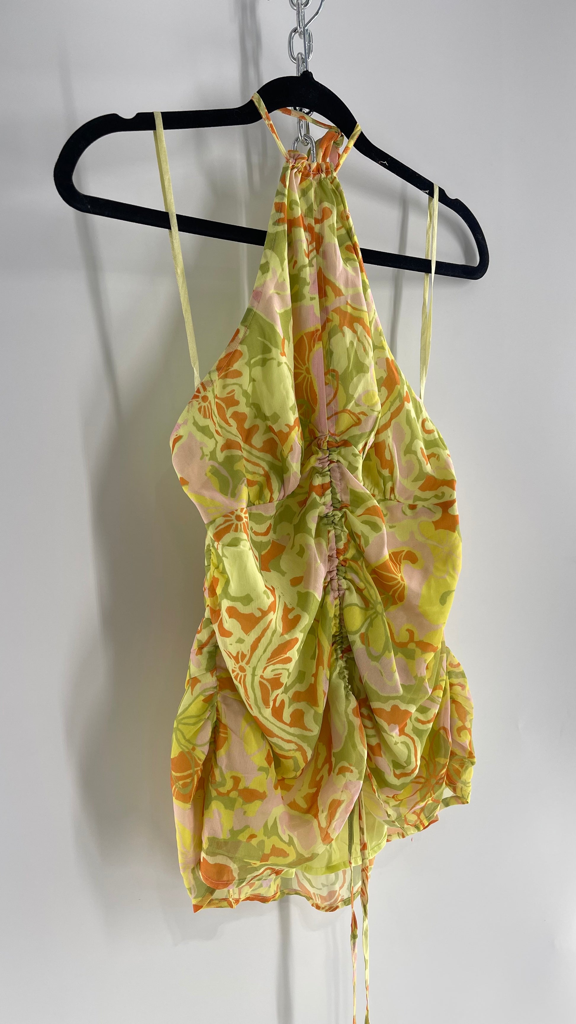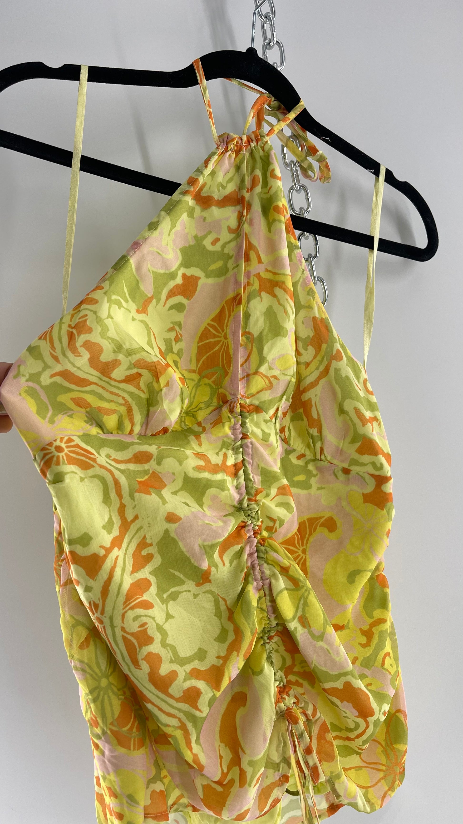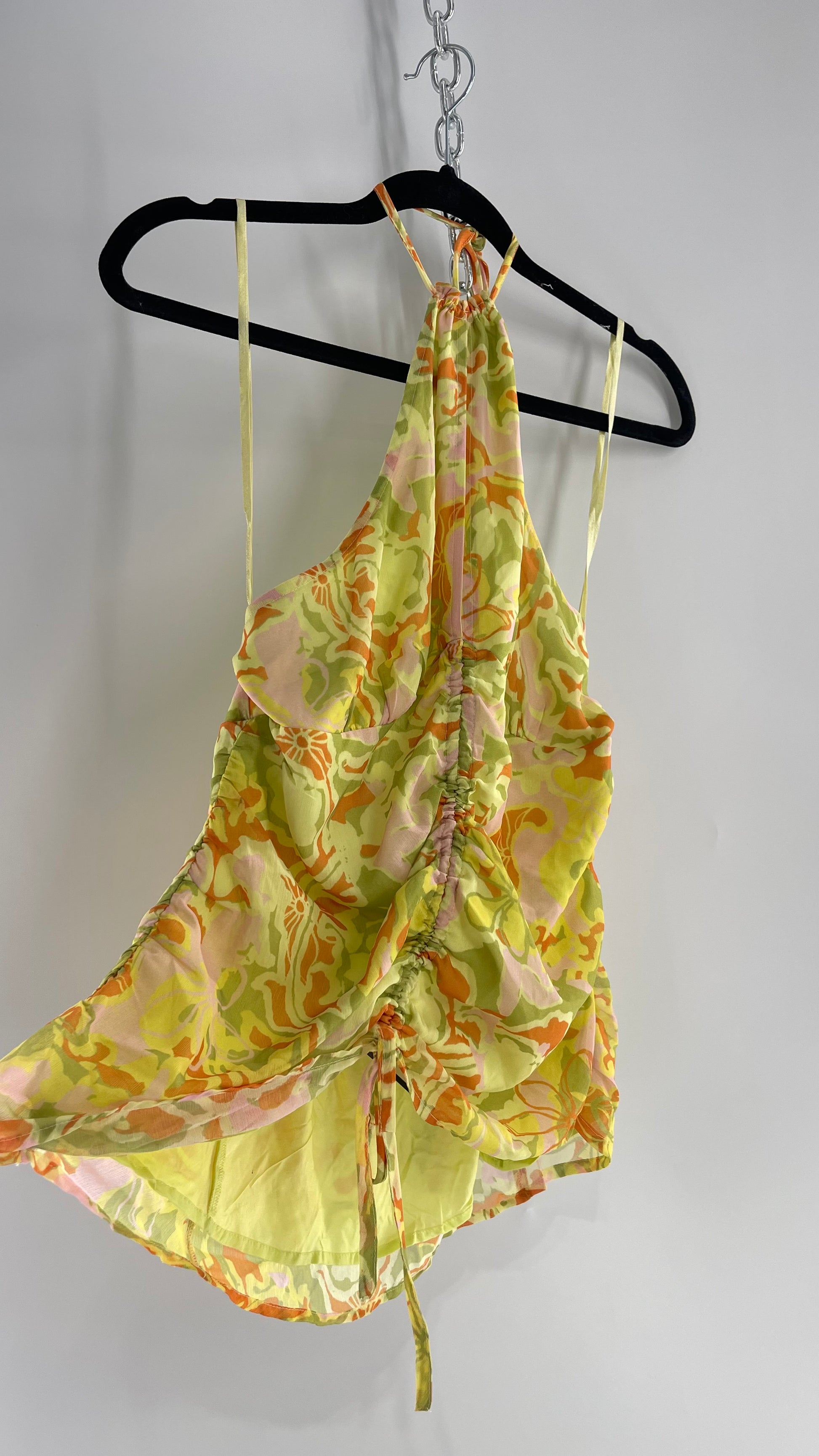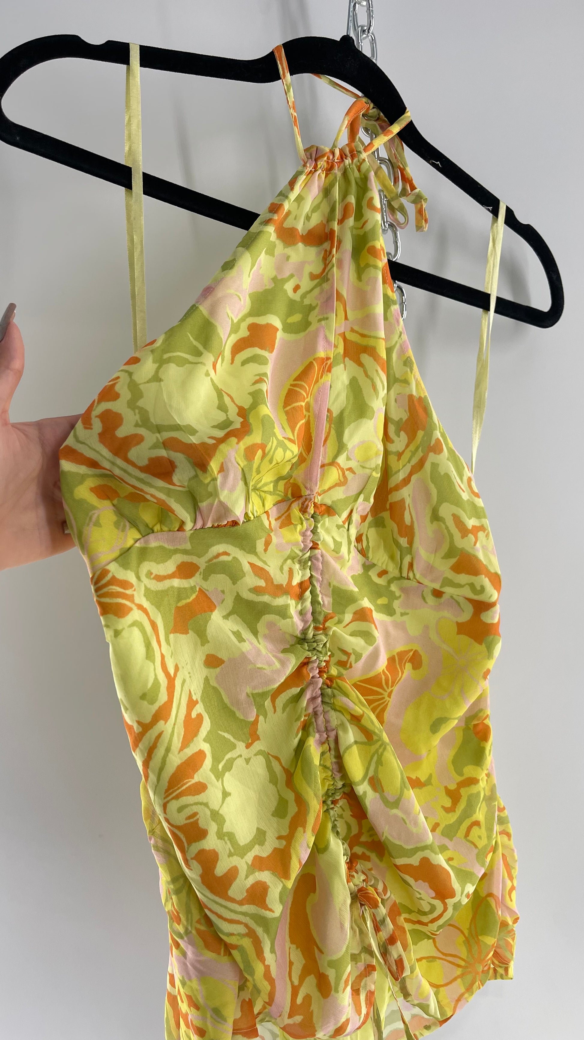 Free People Lime Green and Yellow Ruched Blouse with Cut Out Bust, Adjustable Scrunched Torso and Tie Neck Tank