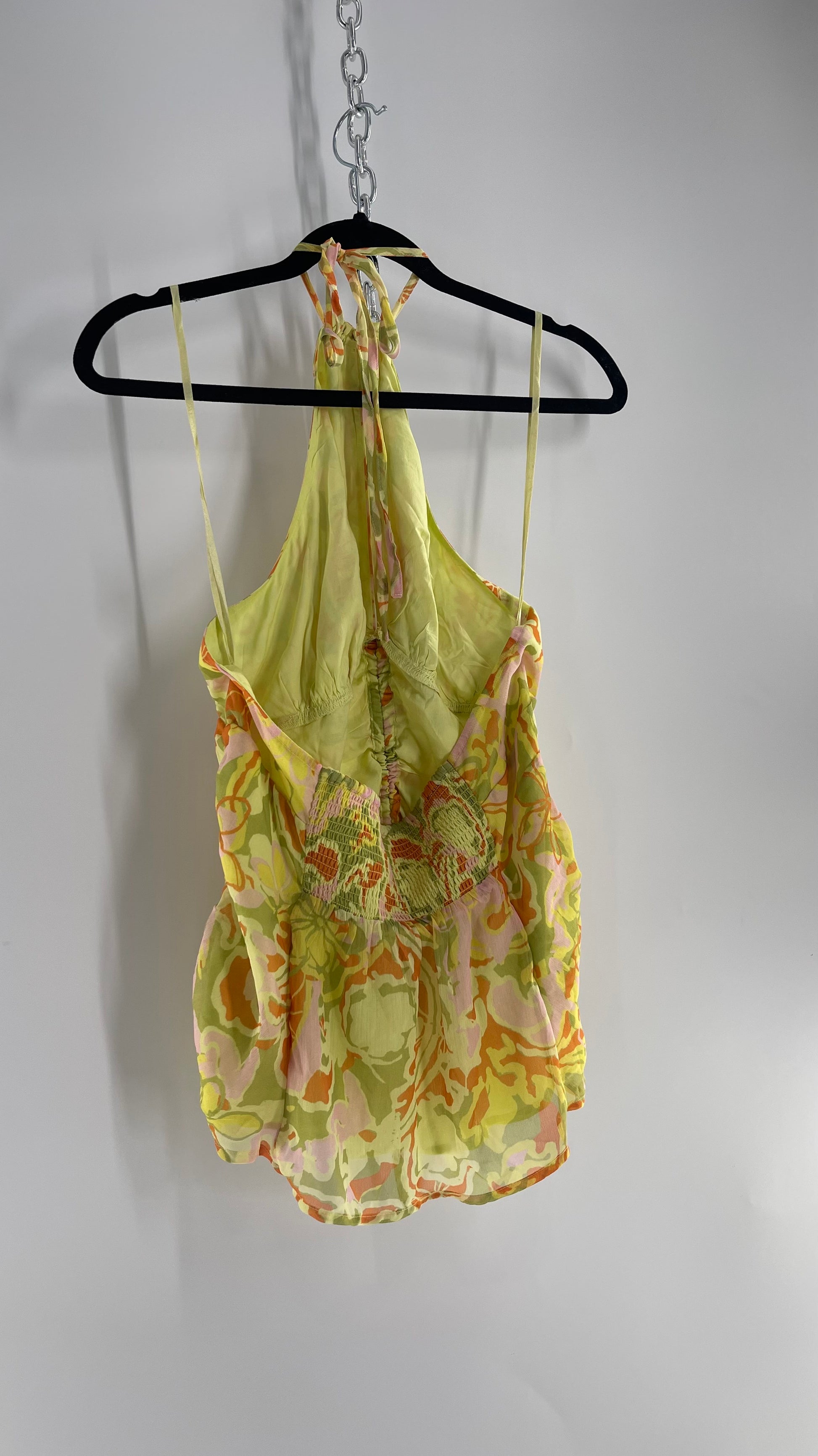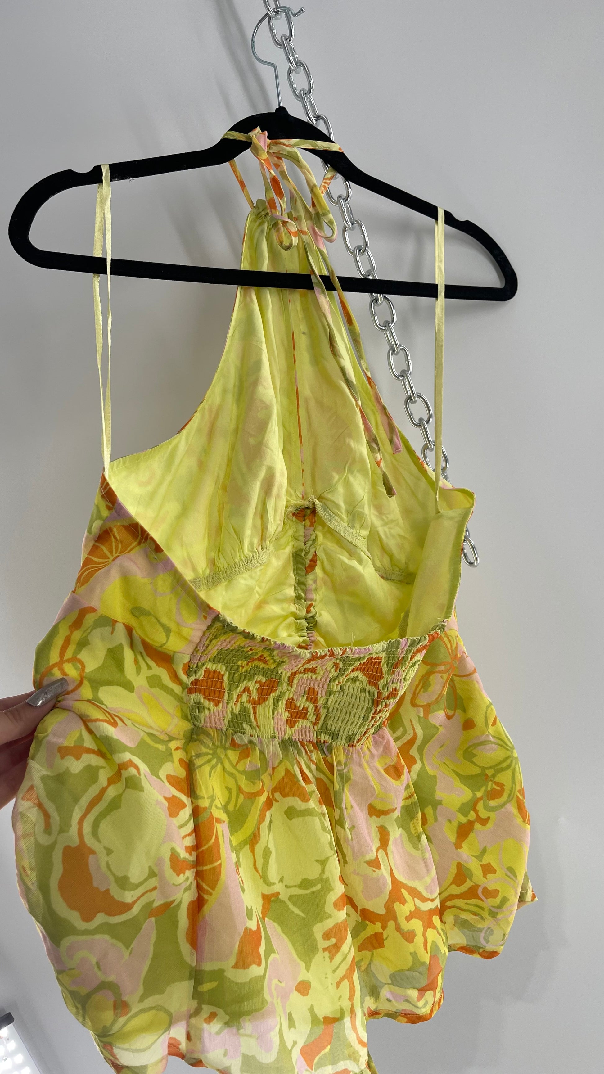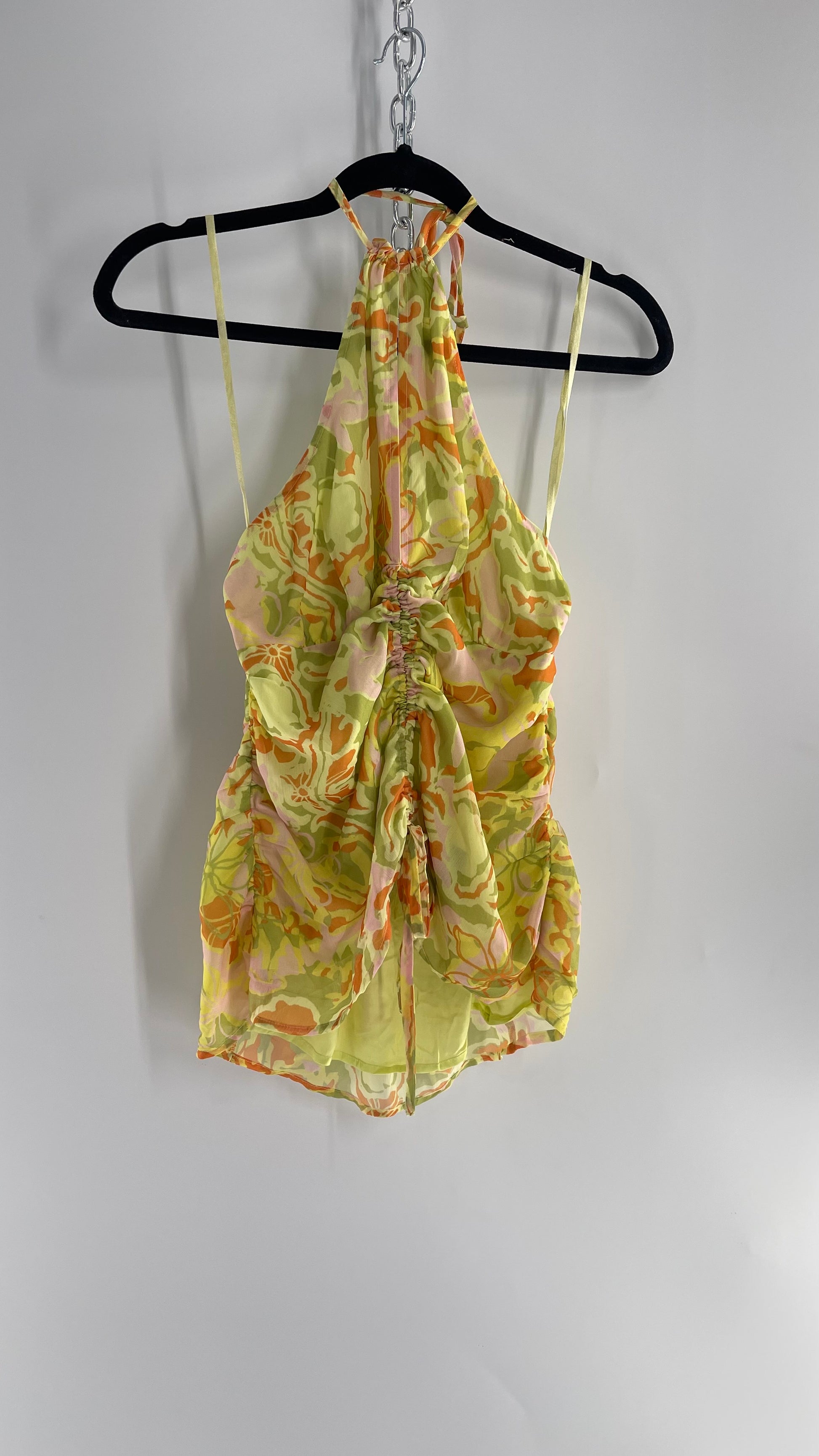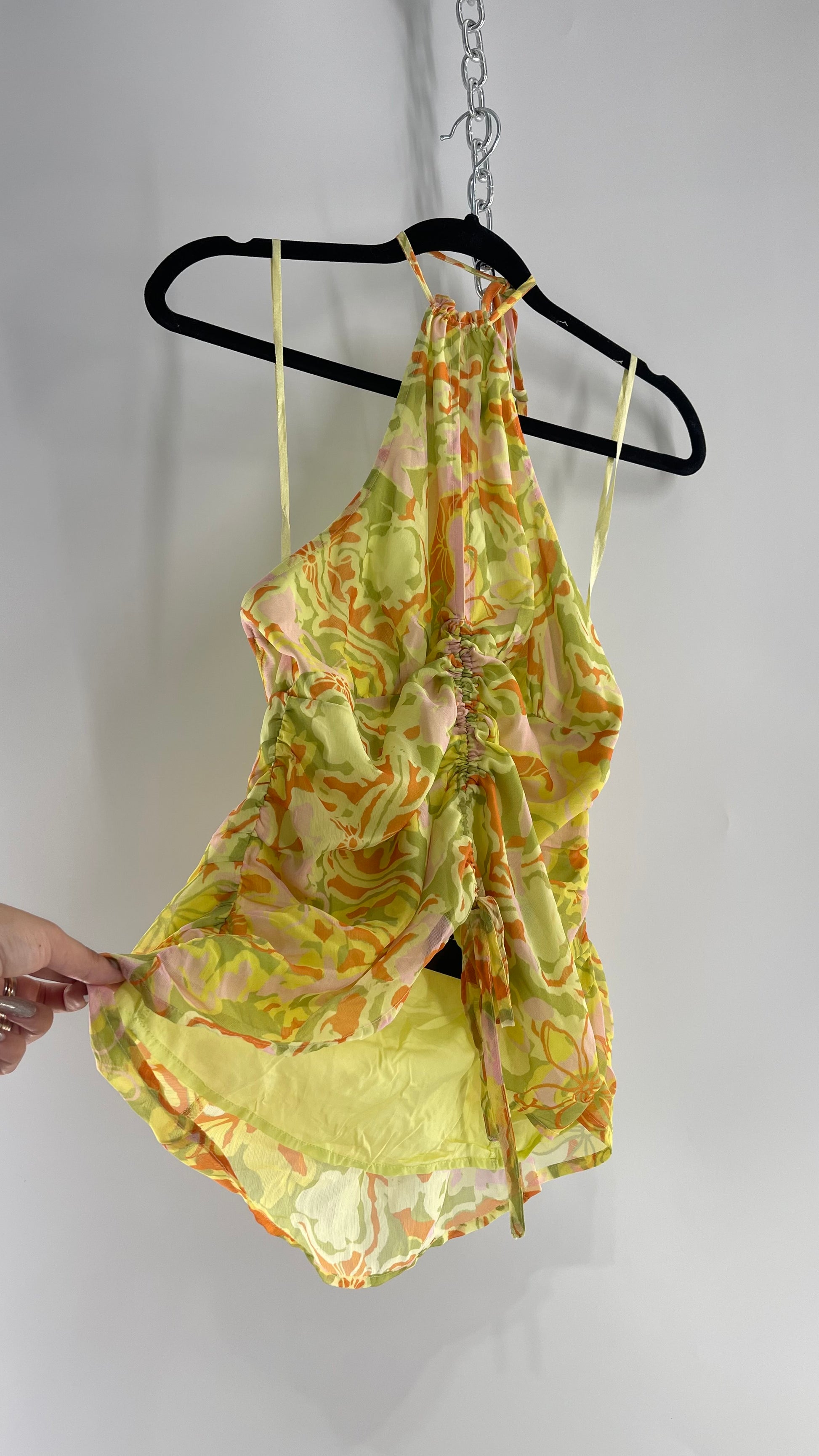 Free People Lime Green and Yellow Ruched Blouse with Cut Out Bust, Adjustable Scrunched Torso and Tie Neck Tank