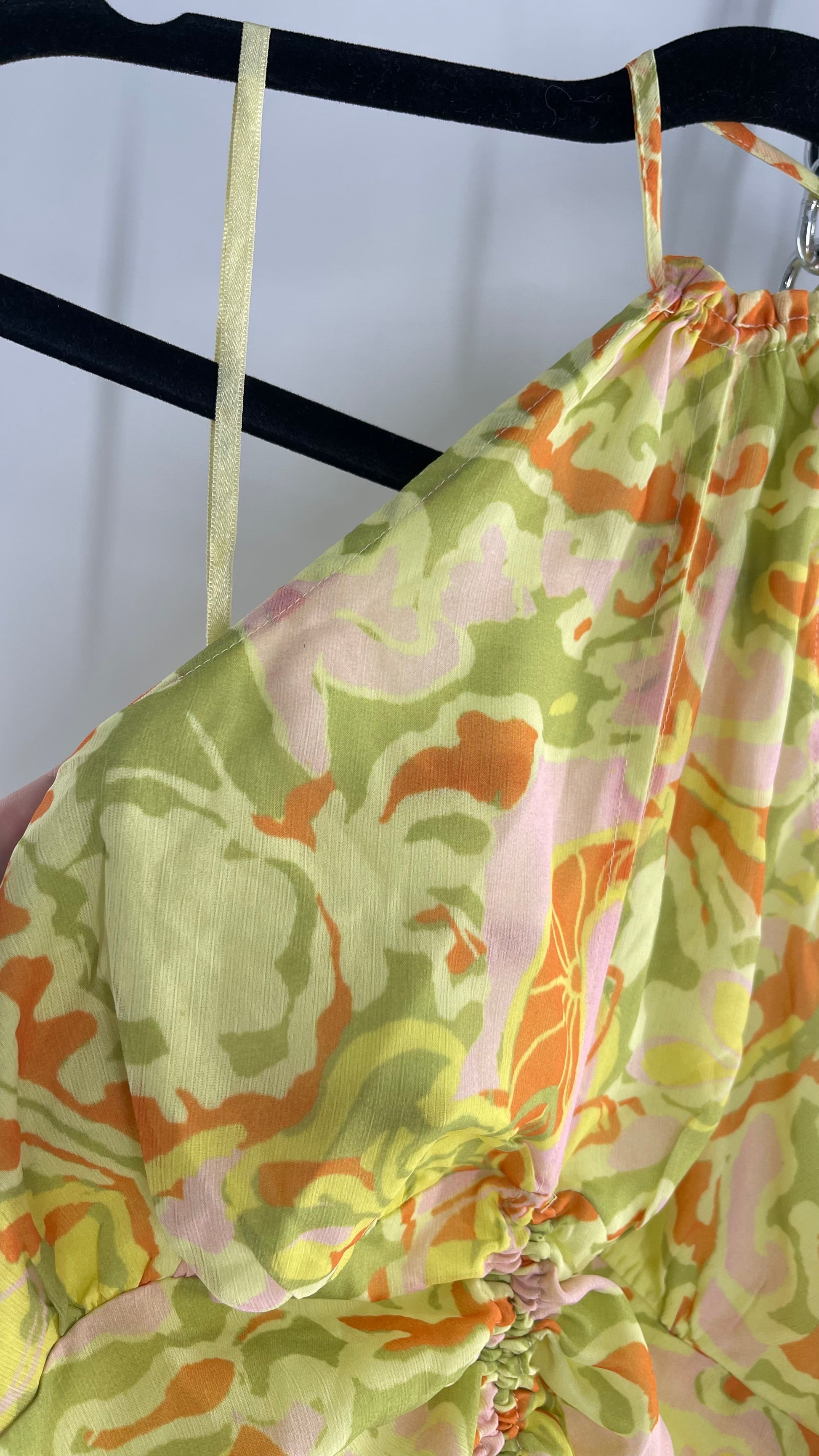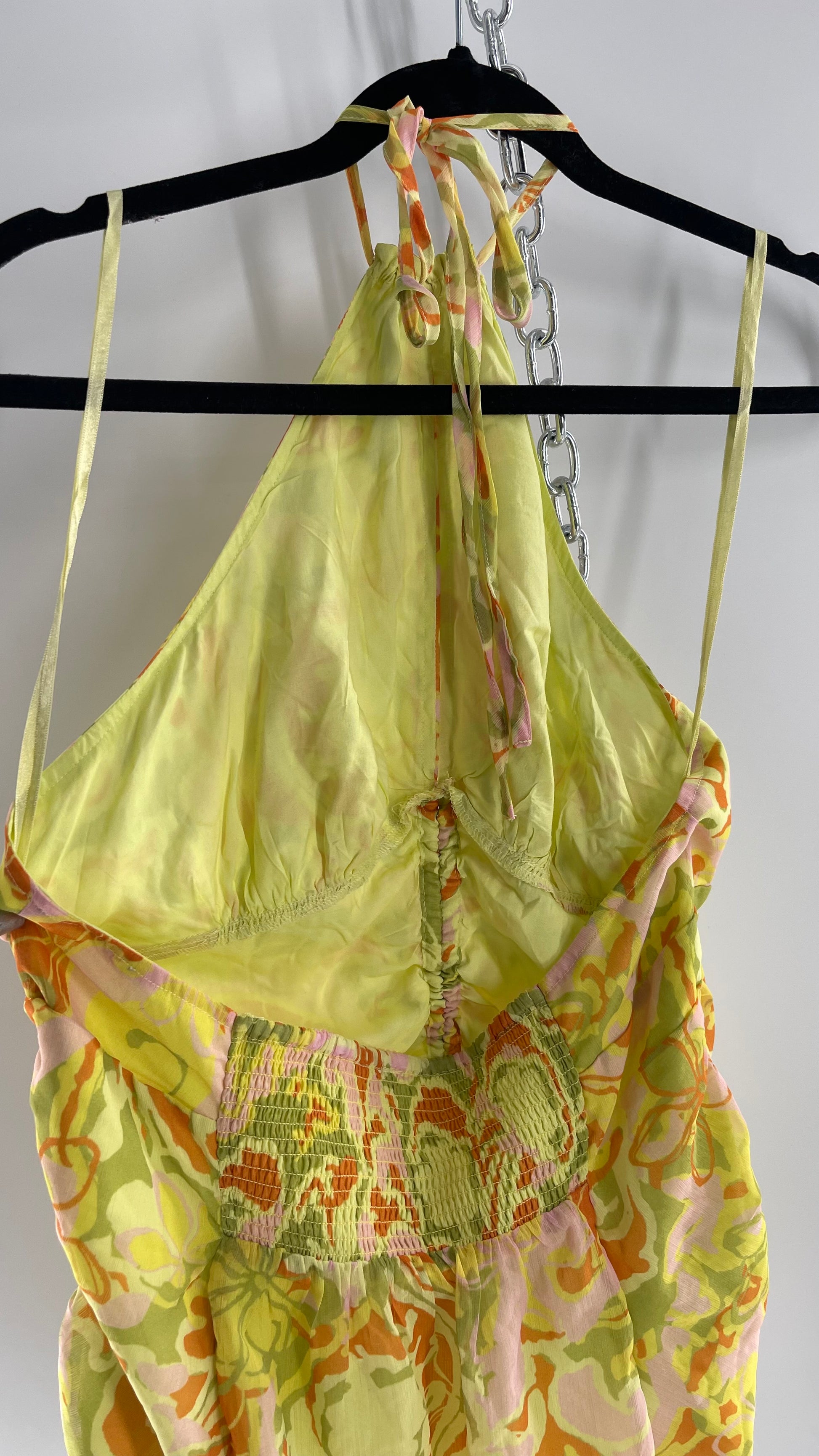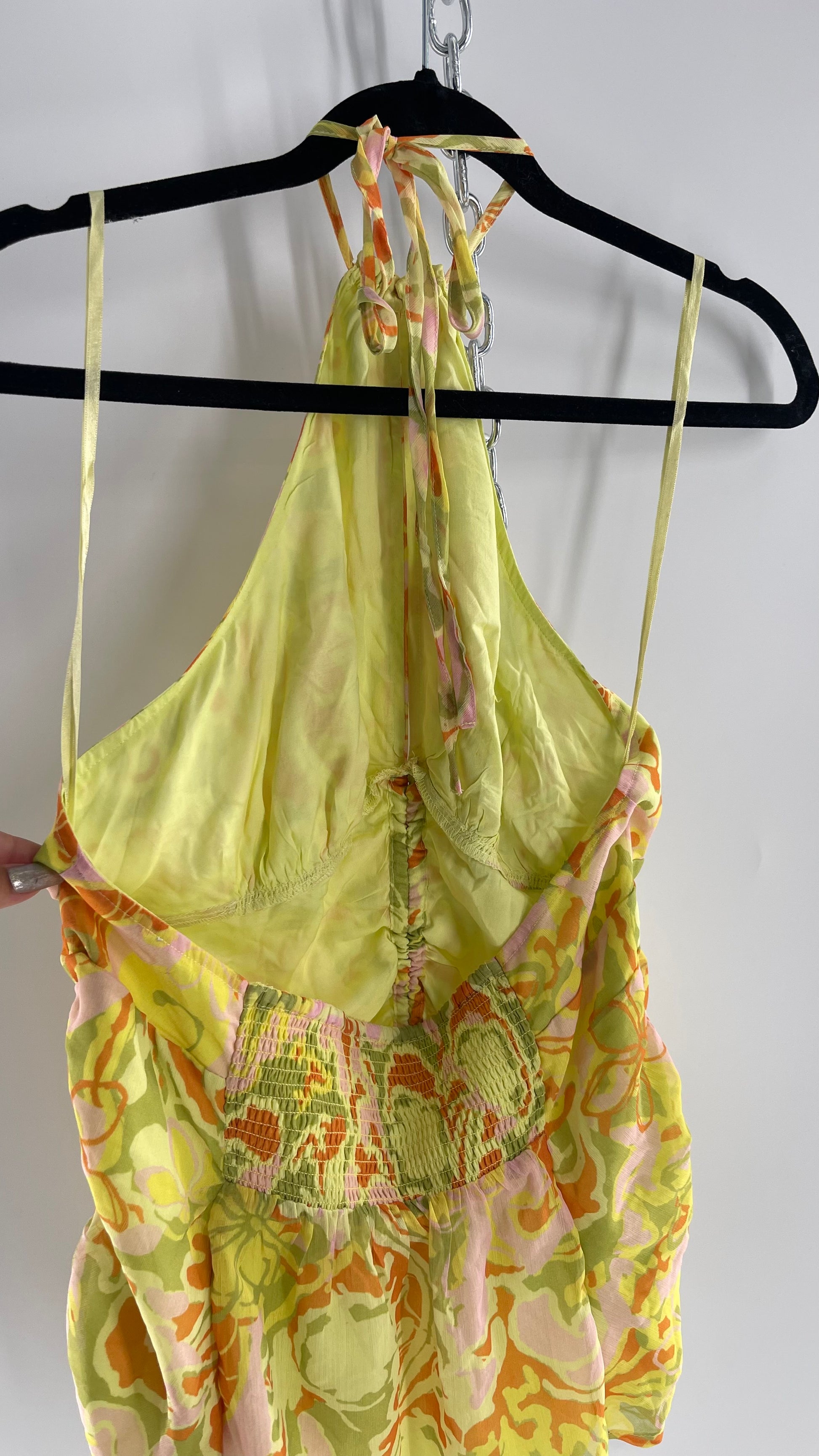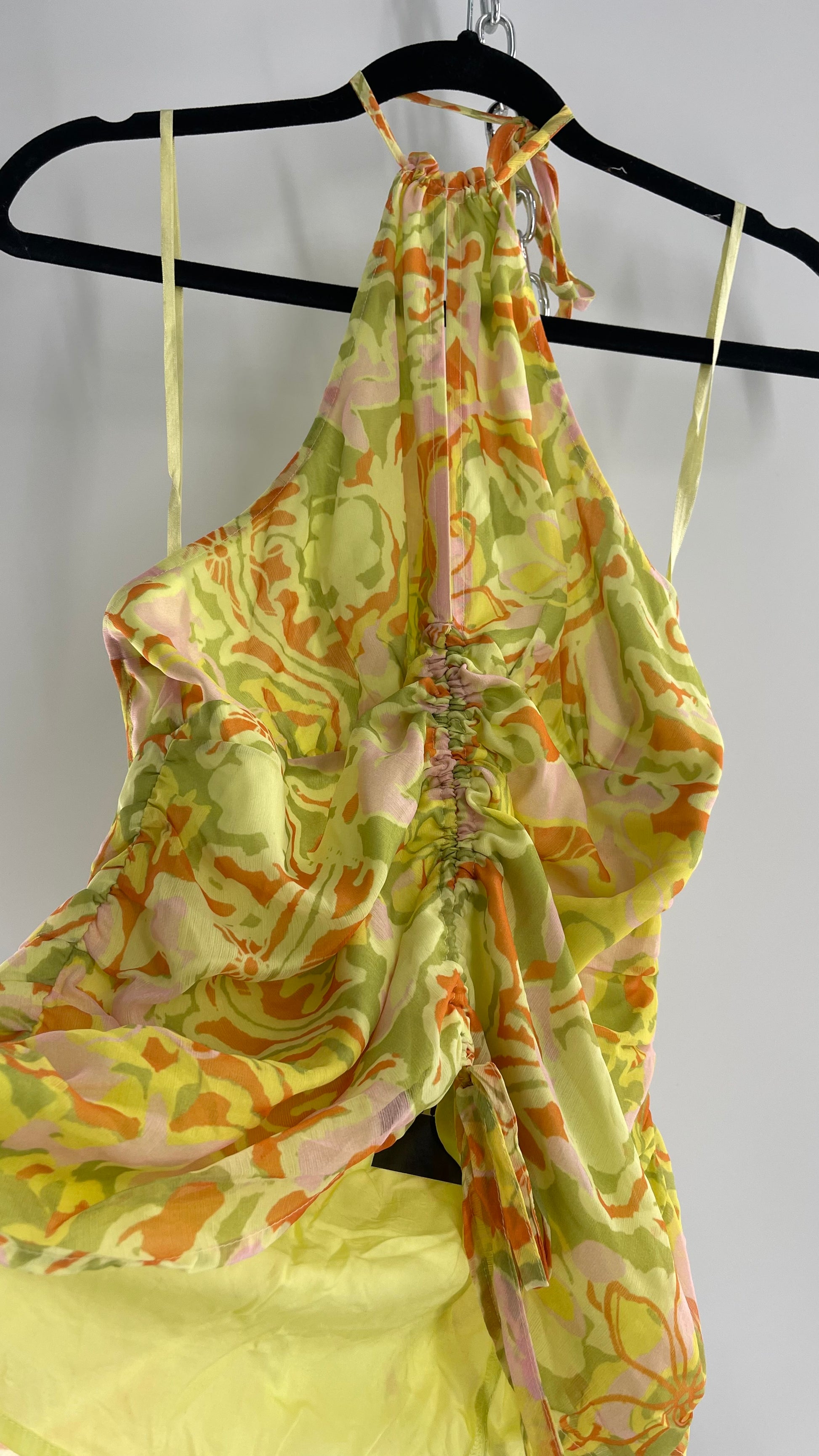 Free People Lime Green and Yellow Ruched Blouse with Cut Out Bust, Adjustable Scrunched Torso and Tie Neck Tank