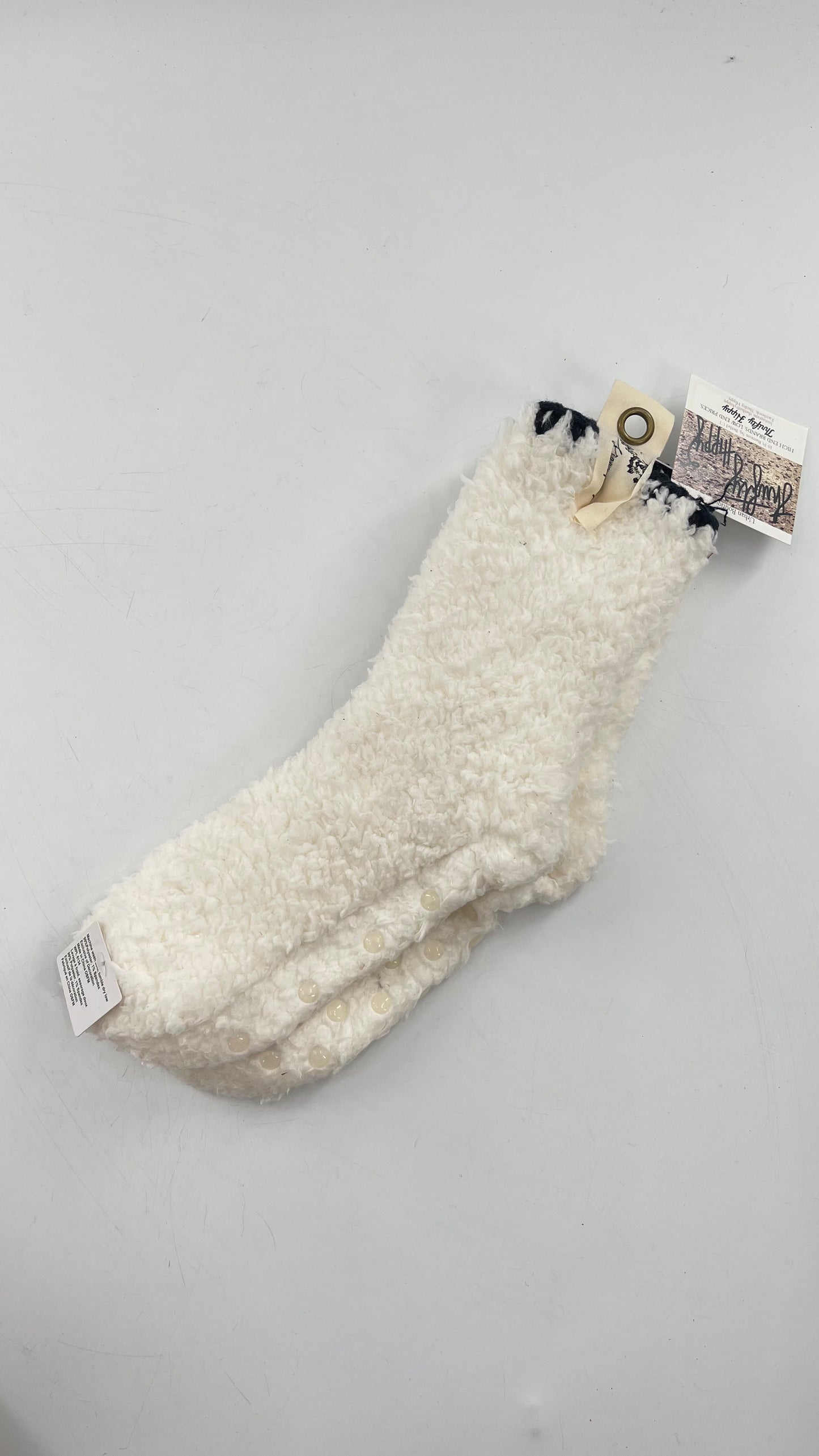 Free People White Fuzzy Socks with Navy Embroidery and rubber grip