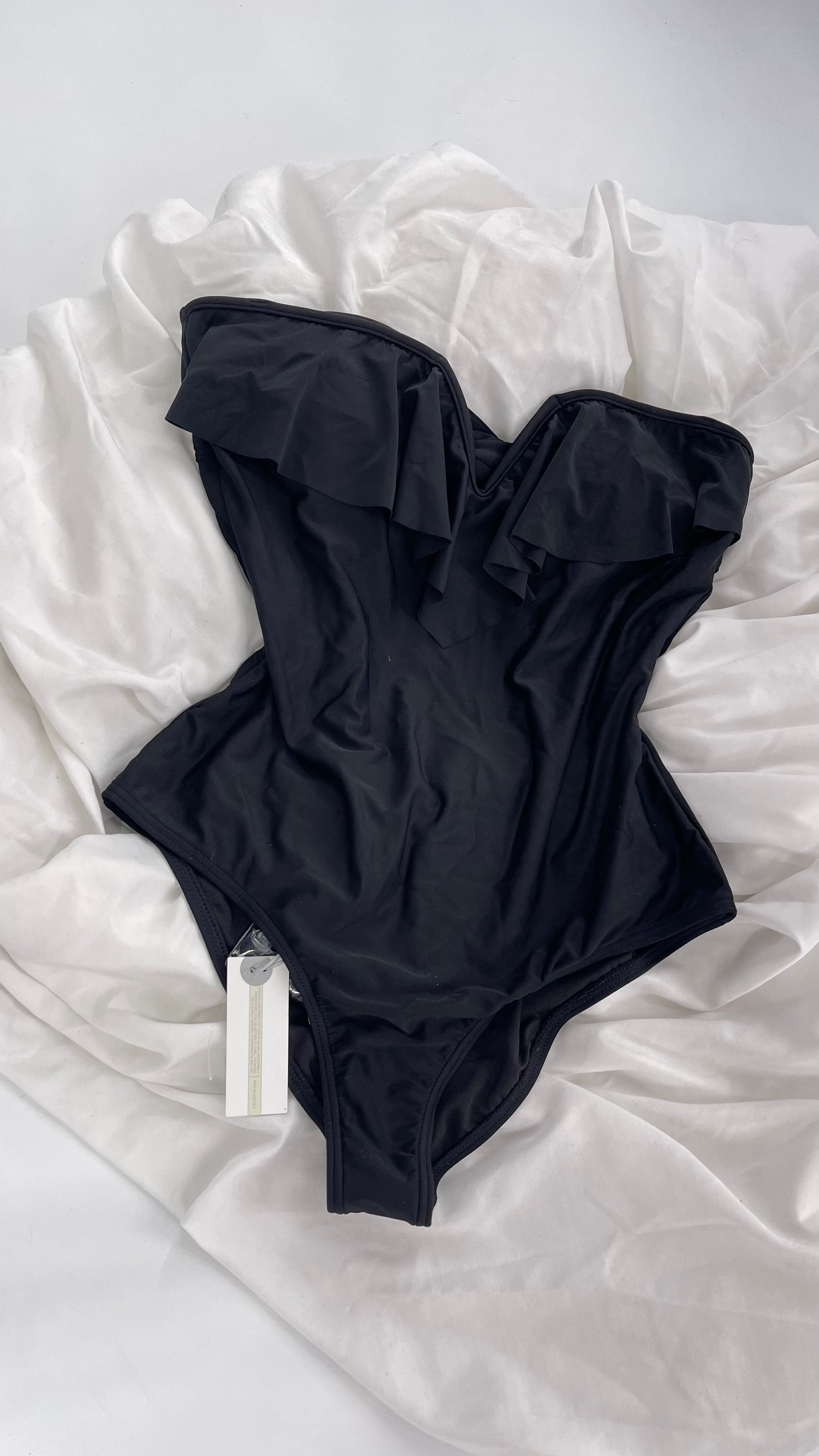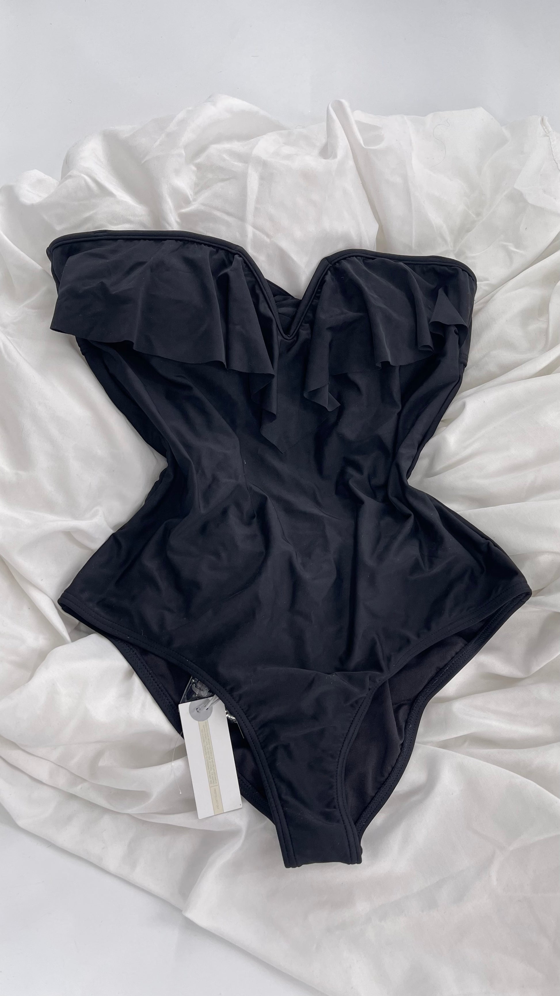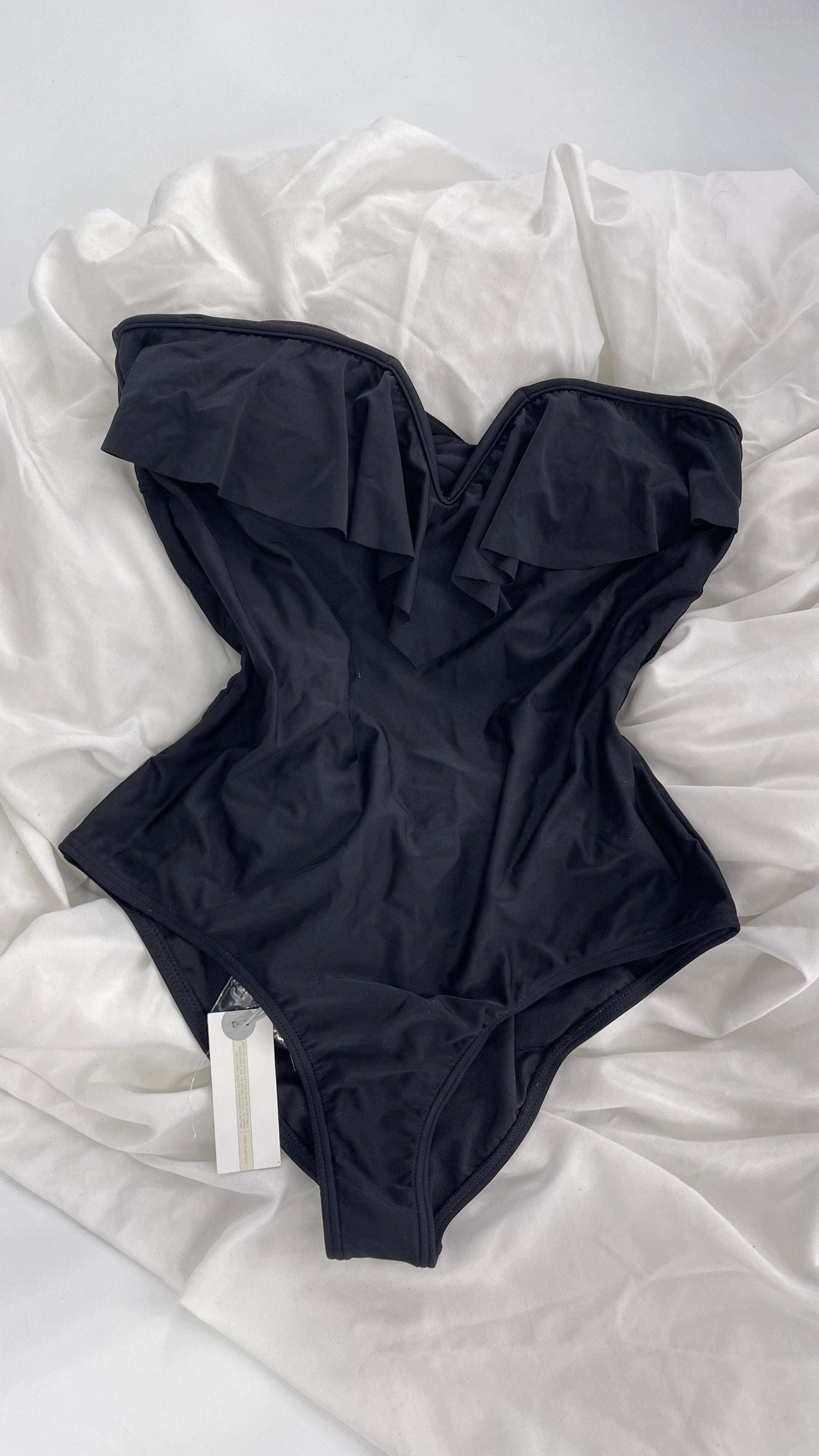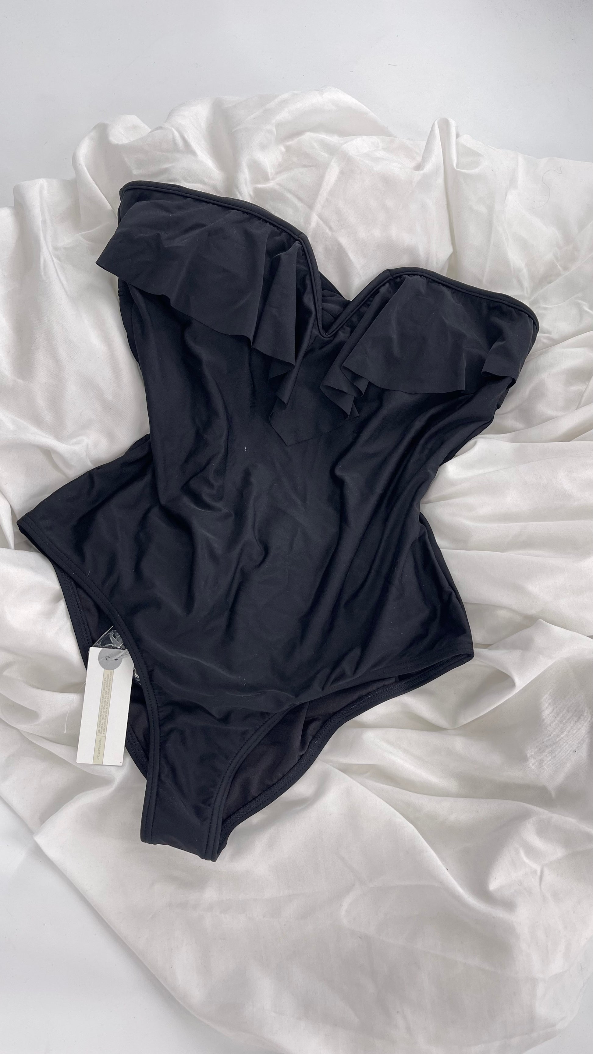 O’Neill Black Swimsuit with Built in Bra with Ruffled Bust, Open Back, Straps and Tags Attached (Large)