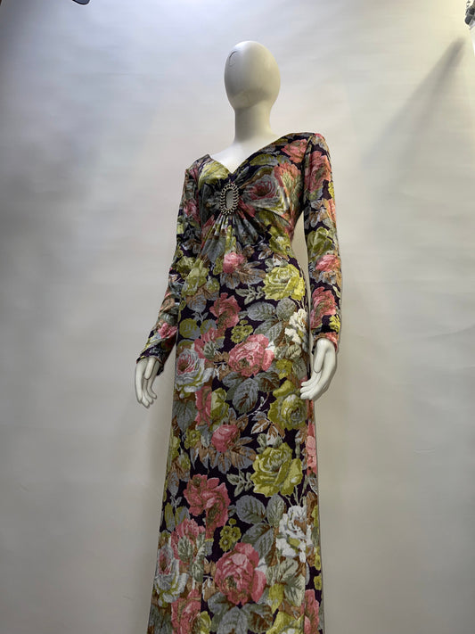 Workers Union (Vintage) Handmade Flowered Velour With Rhinestone Broche Maxi Dress (Sized M)