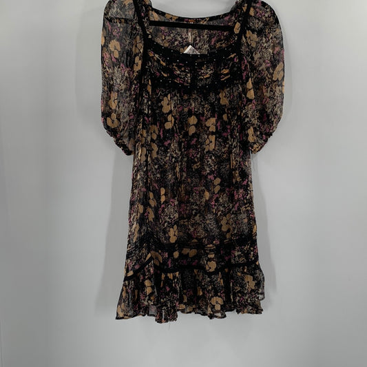 Urban Outfitters Flowered Yellow And Orange Print With Black Polka Dots Bubble Sleeves (Size XS)