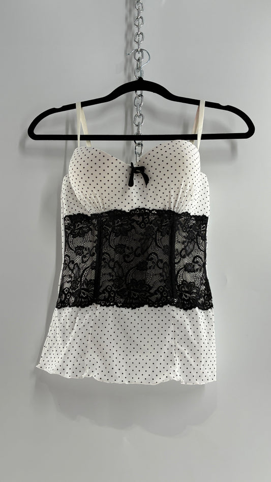 Vintage Black and White Polka Dotted Bustier Babydoll with Lace Bodice Detailing (Medium)