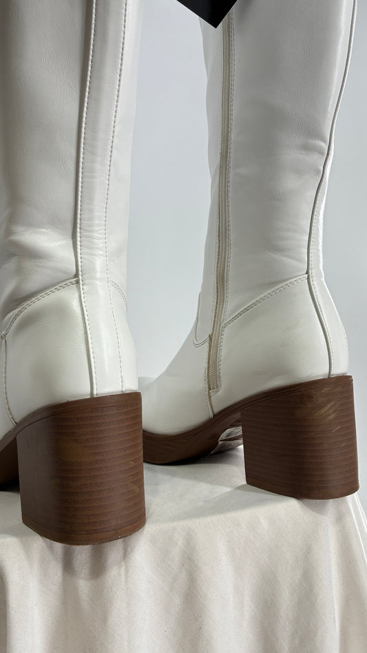 Vintage TOP MODA White Knee High GoGo Boots with Chunky Heel (7.5)