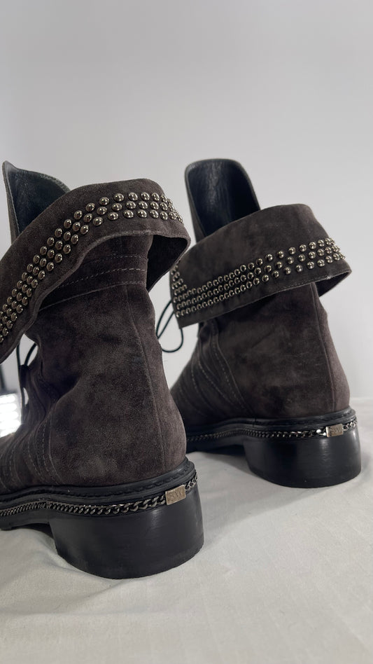 Stuart Weitzman Yadastud Grey Suede Leather Studded, Chainlink Boots (8)