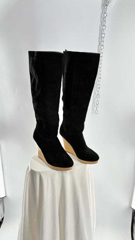 Vintage Black Genuine Suede Leather Knee High Boots with Skinny Wooden Wedge Heel (9)