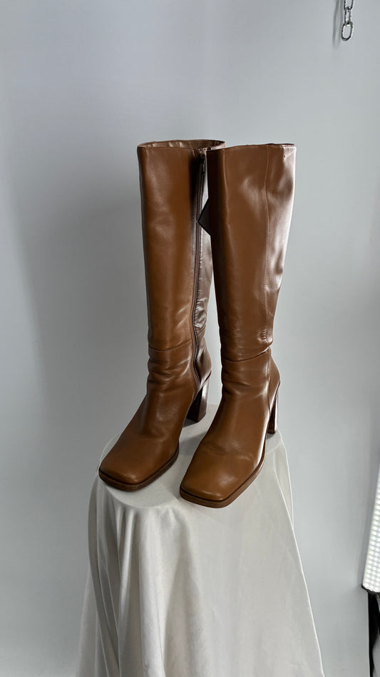 Vintage Strive Genuine Leather Square Toe Knee High Boots with Chunky Block Heel Made in Uruguay (9.5)
