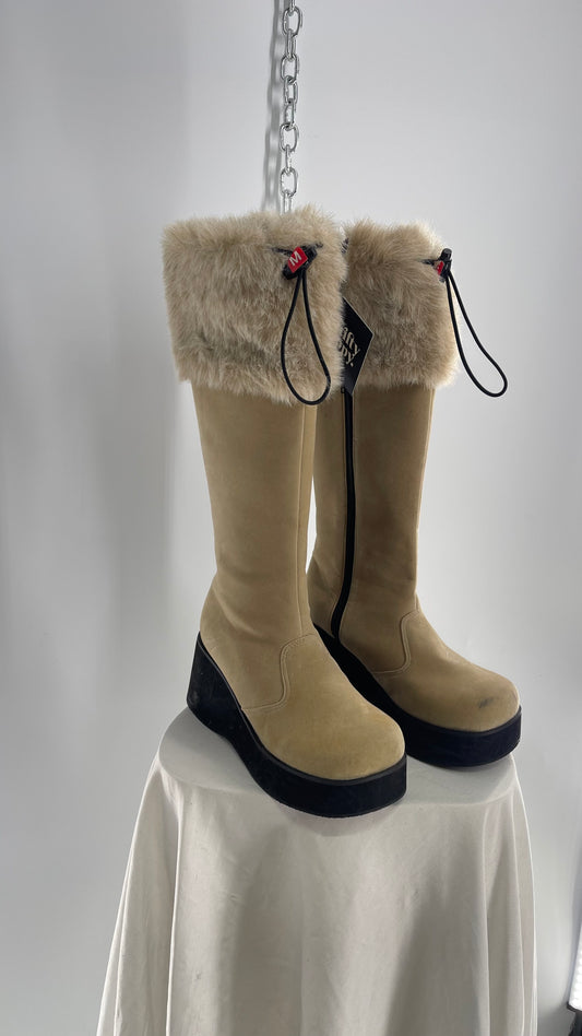 Vintage Faux Fur Trim Tan Platform Wedge Knee High Boots (6)