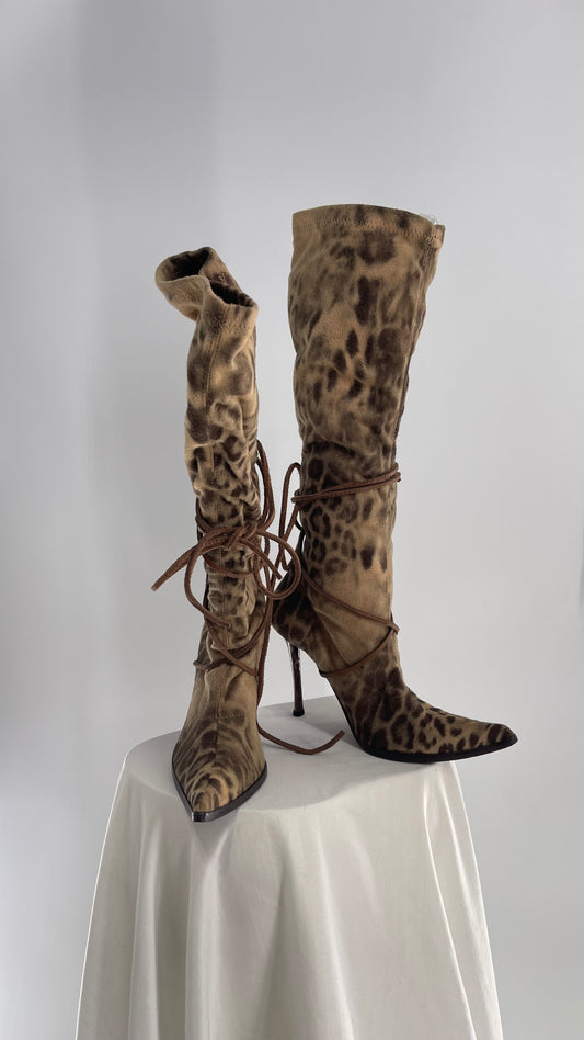 Vintage Alberto Venturini Animal Print Tie Up Pointed Toe Boots (37)