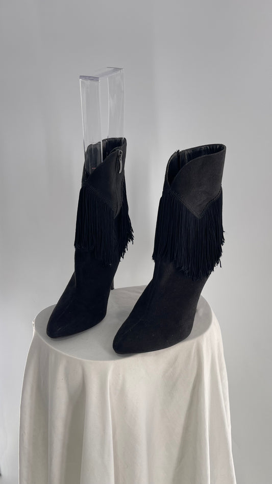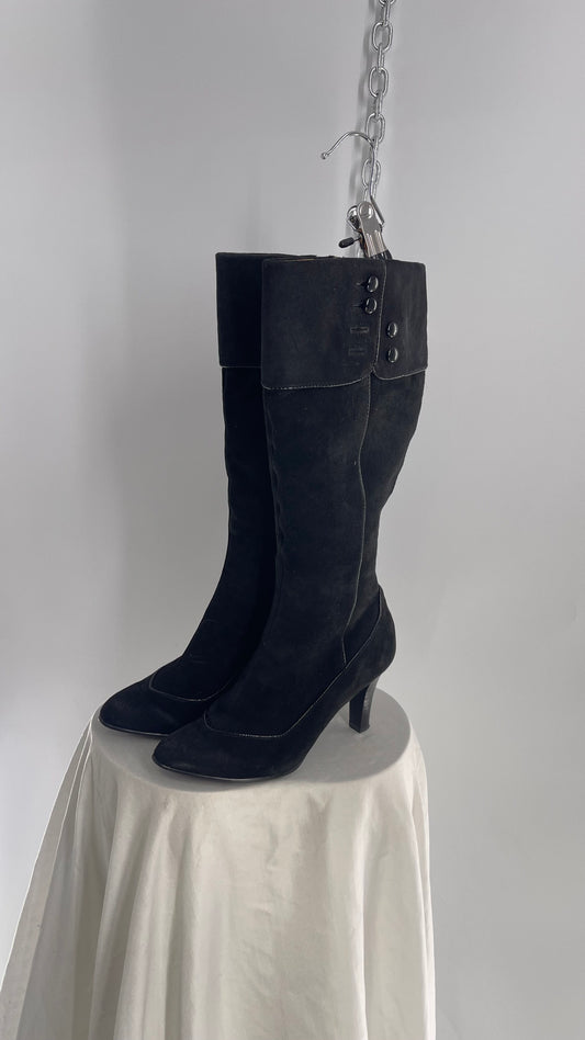 Vintage 1990s Stuart Weitzman Black Suede Leather Kitten Heel Pointed Toe Knee Highs (8.5)