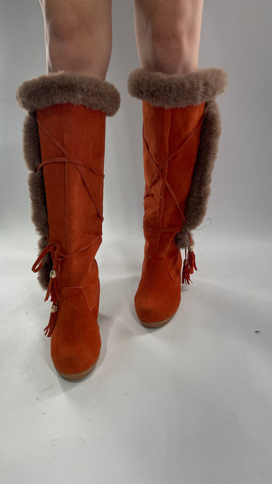 Faux Suede Lace Up Orange Wedge Boots with Faux Fur (37)