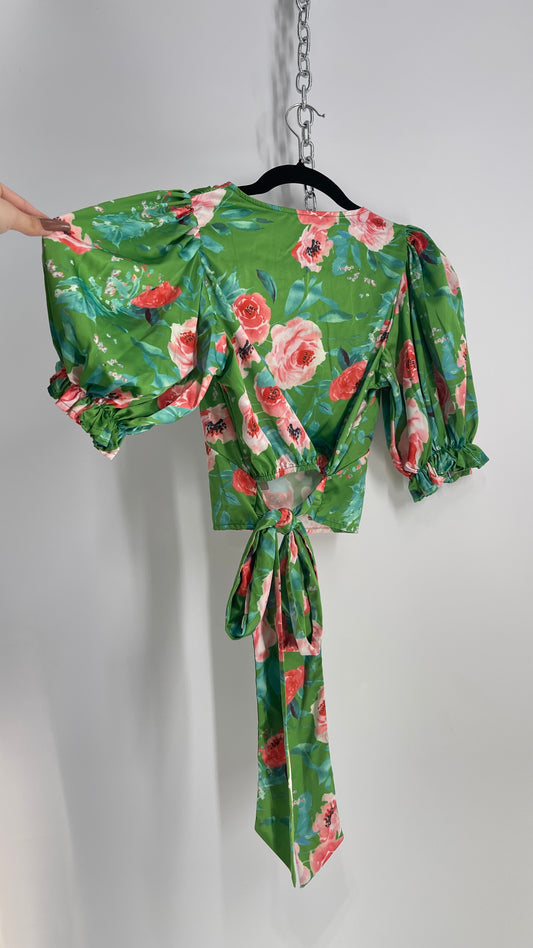 OPI Green Floral Puff Sleeve Open Tie Back Blouse (small)