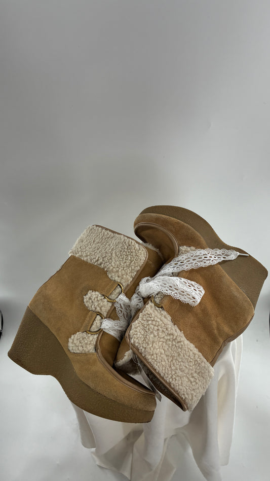 Vintage TOMMY GIRL Suede Leather Wedge Heels with Sherpa Details and Lace Trim Laces (8)