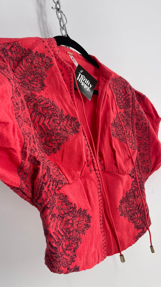 Free People Coral Red Puff Sleeve Top with Heavy Embroidery (XS)