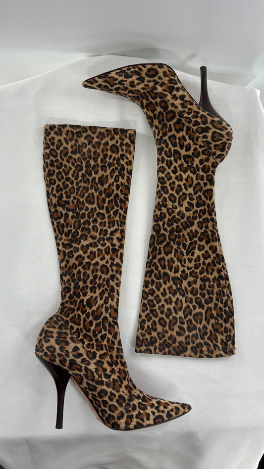 Vintage 1990s MARTINEZ VALERO Cheetah Print, Pointed Toe, Skinny Heel Knee High Boots (8)