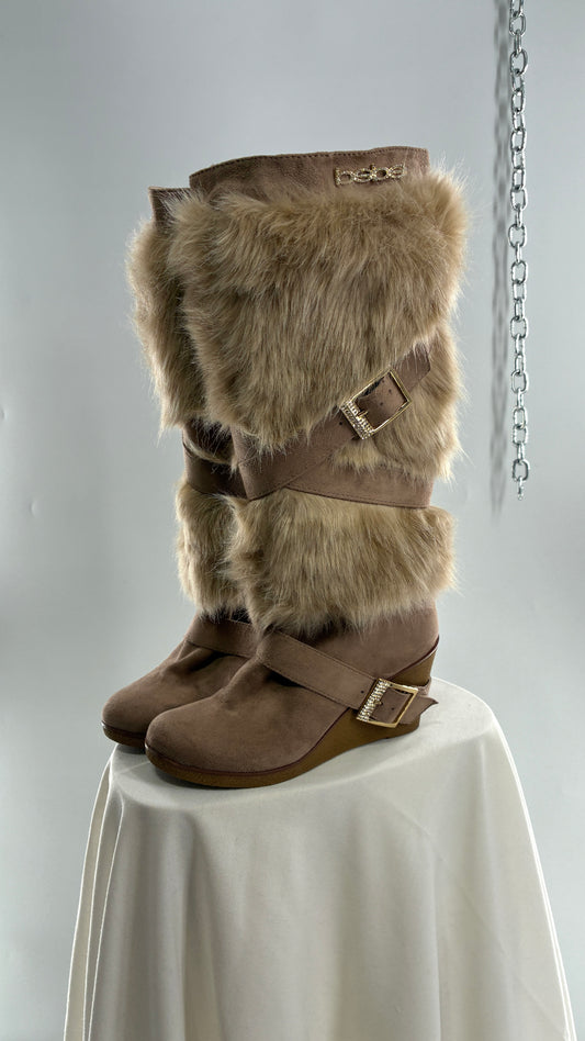 Vintage BEBE Wedge Heel Knee High Vegan Fur, Strappy Boots (6)