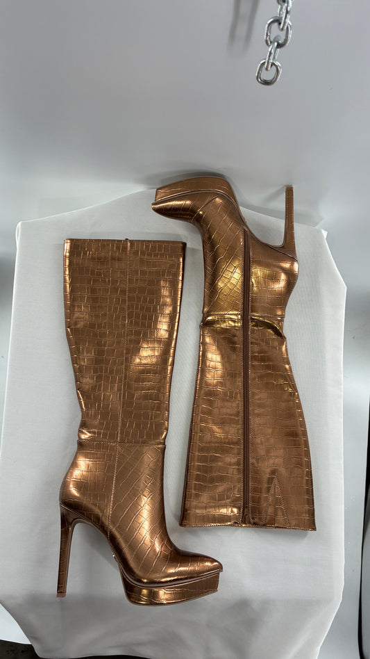 Vintage THALIA SODI Bronze Embossed Crocodile Texture Platform, Pointed Toe, Knee High Boots (6)