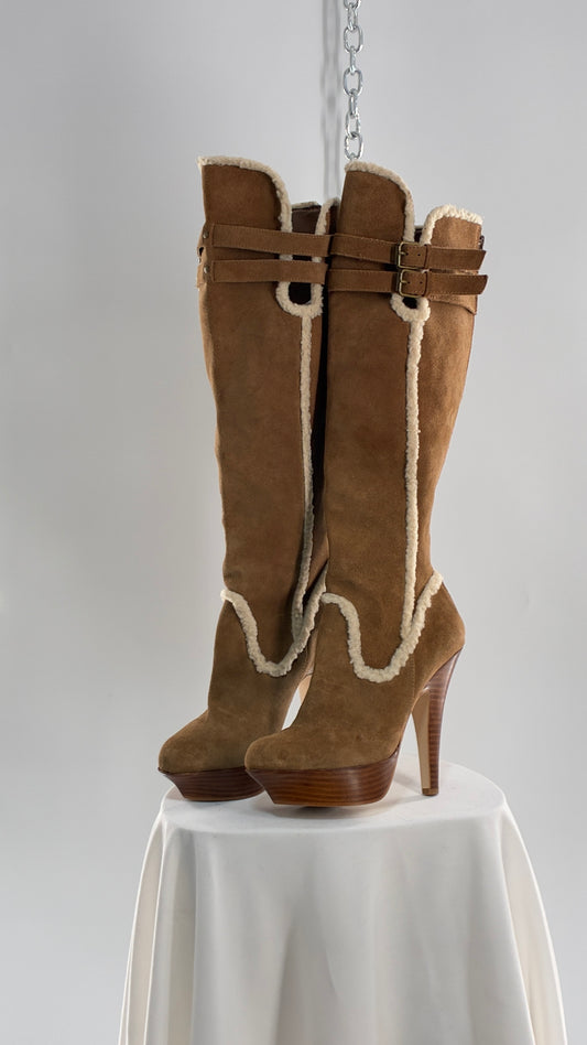 Vintage BEBE Genuine Suede Leather Stiletto, Platform Knee High Boots with Shearling Piping (8B)