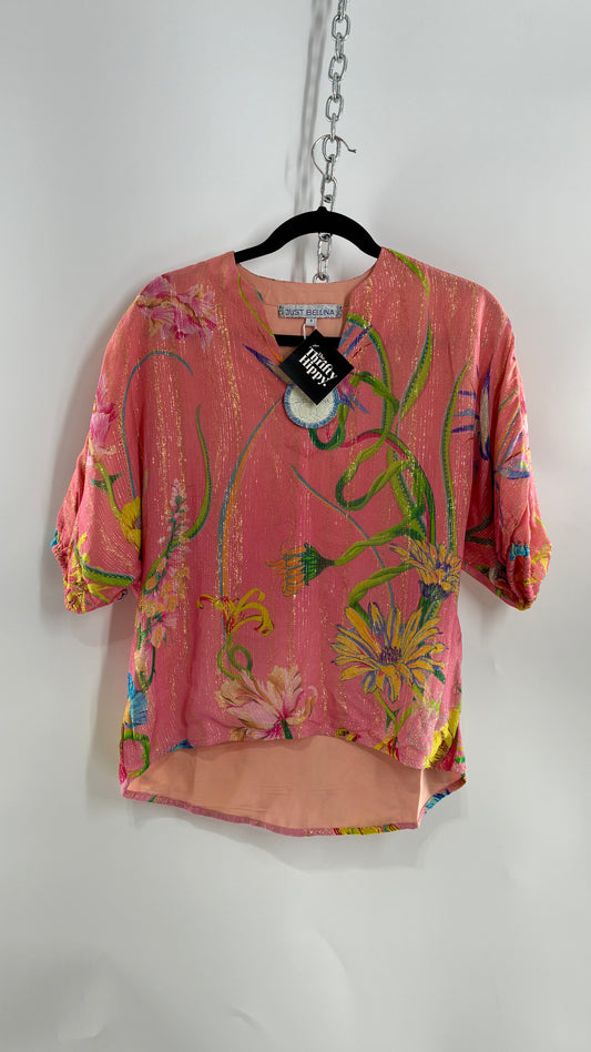 JUST BELLINA Pink Tropical Patterned Puff Sleeve Blouse with Gold Threading and Tags Attached (Small)