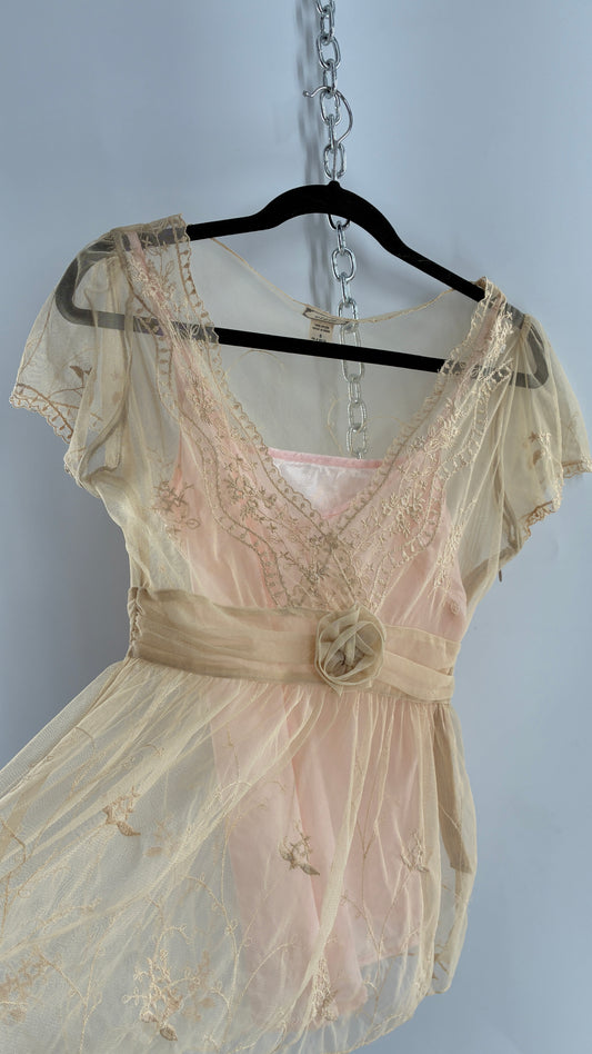 Vintage VIOLA Beige Sheer Mesh Blouse with Embroidered Details and Underbust Rosette (6)