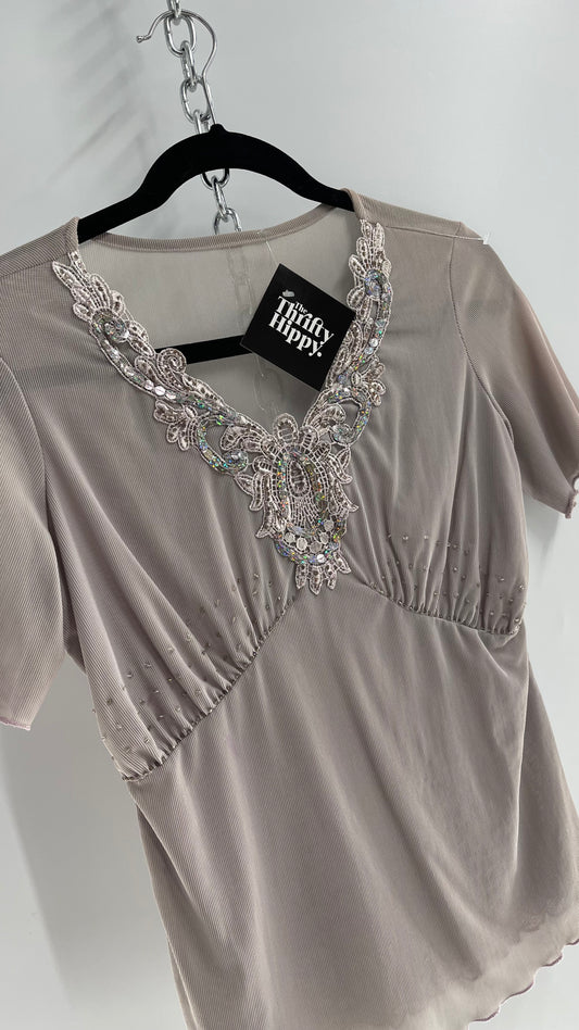 Vintage 1990s Gray Mesh V Neck with Lace, Beading and Sequin Details (Medium)