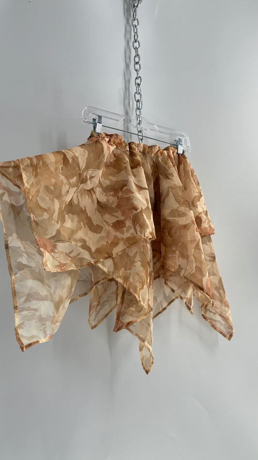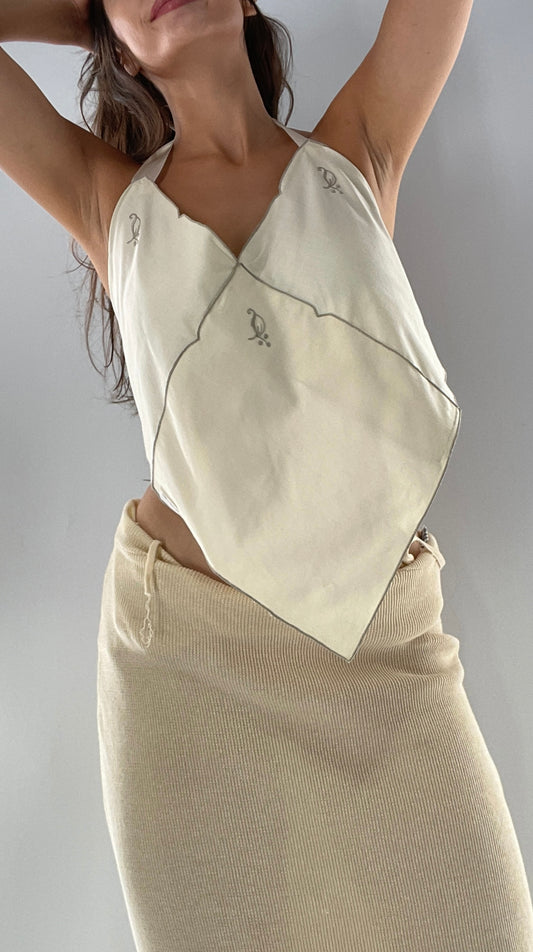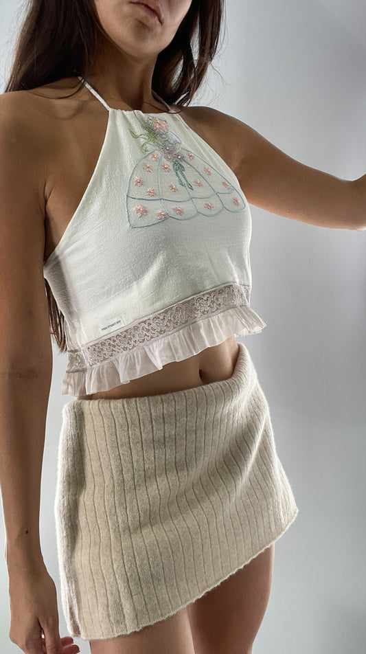 Vintage Handmade Pink and Green Floral Embroidered Backless Handkerchief Blouse (One Size)
