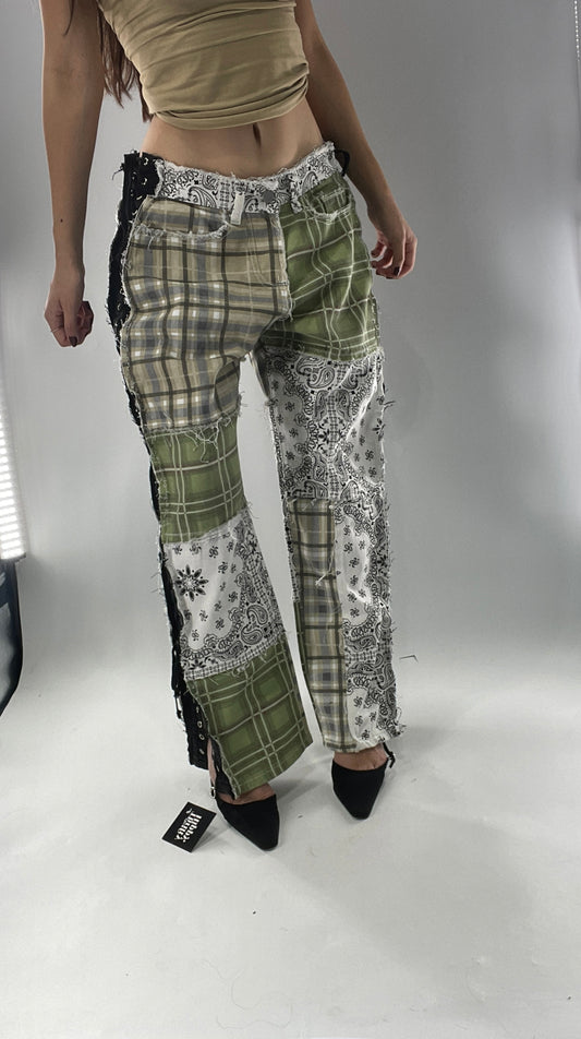 Handmade Custom Tie Side Bandana Patchwork Baggy Legs with Adjustable Open Lace Up Sides (Medium)