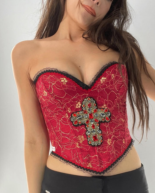 Custom Red Lace Corset with Beaded Cross Appliqué and Lace Trim (XS/S)