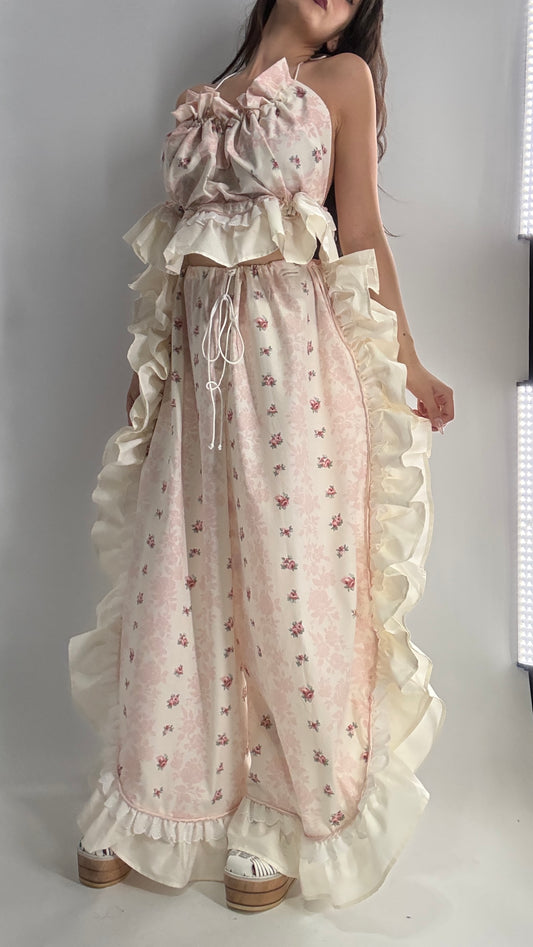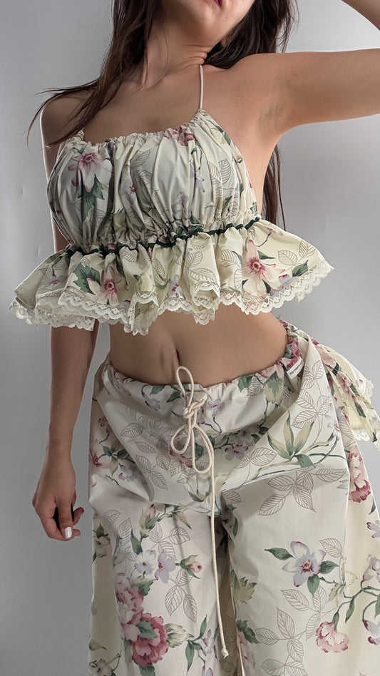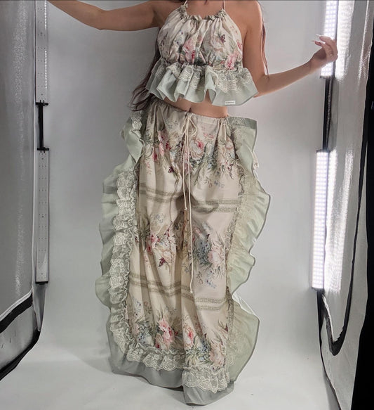 Handmade Vintage Muted Florals Two Piece Set with Adjustable Waist and Bust Lines (XS-XL)