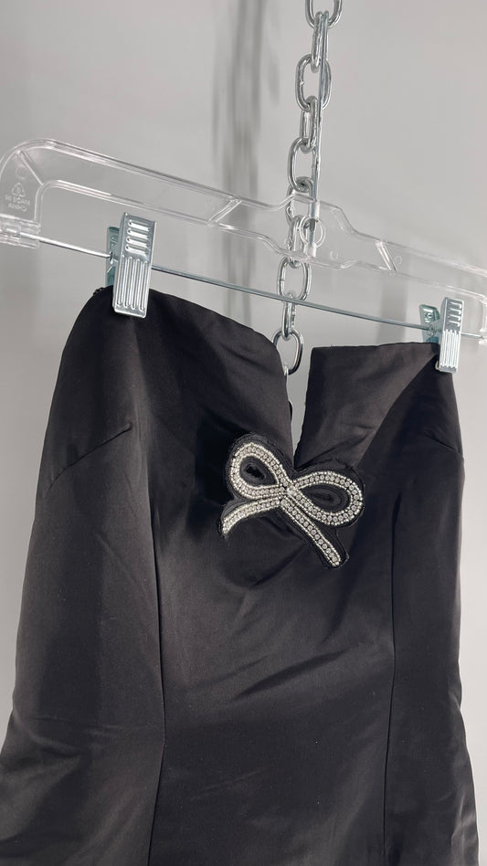 Maeve Black Mini Dress with Drop Hip Bubble Hem, Lace/Bow Appliqué and Tight Bodice (Small)