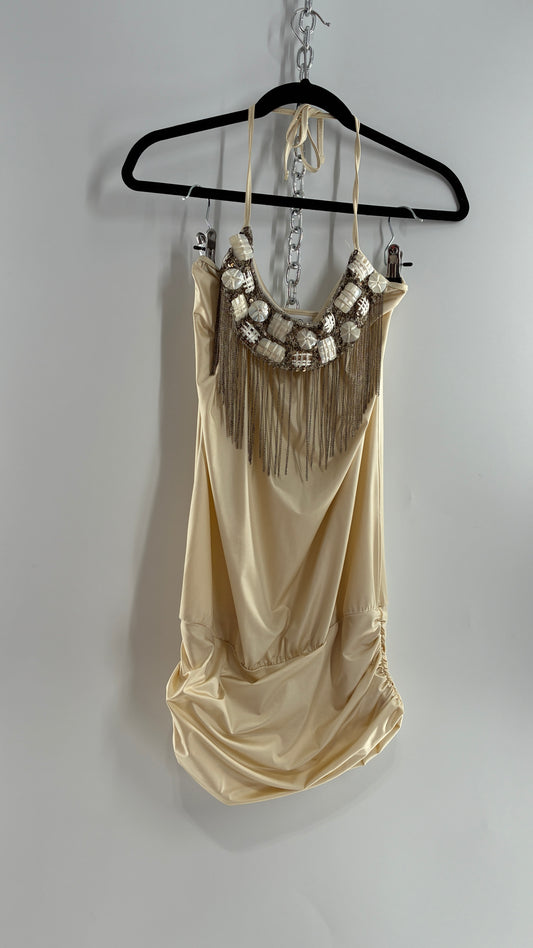 Beach Bunny Ivory Lycra Balloon Hem Mini Dress with Exaggerated, Beaded and Metal Chain Neckline (Small)