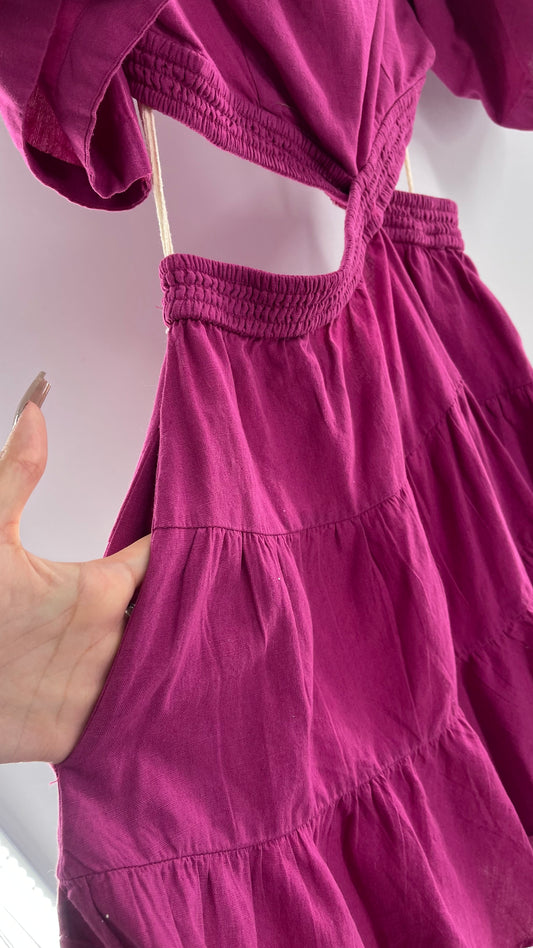 Free People Mauve Fuchsia Cotton/Linen Cut Out Sides Open Back Mini Dress (Small)