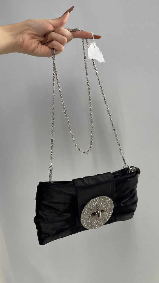 Vintage 1990s Black Satin Ruched Rhinestone Clutch Purse