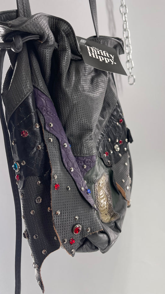 Vintage 1990s Gray Leather Patchwork Purse Covered in Rhinestones and Studs
