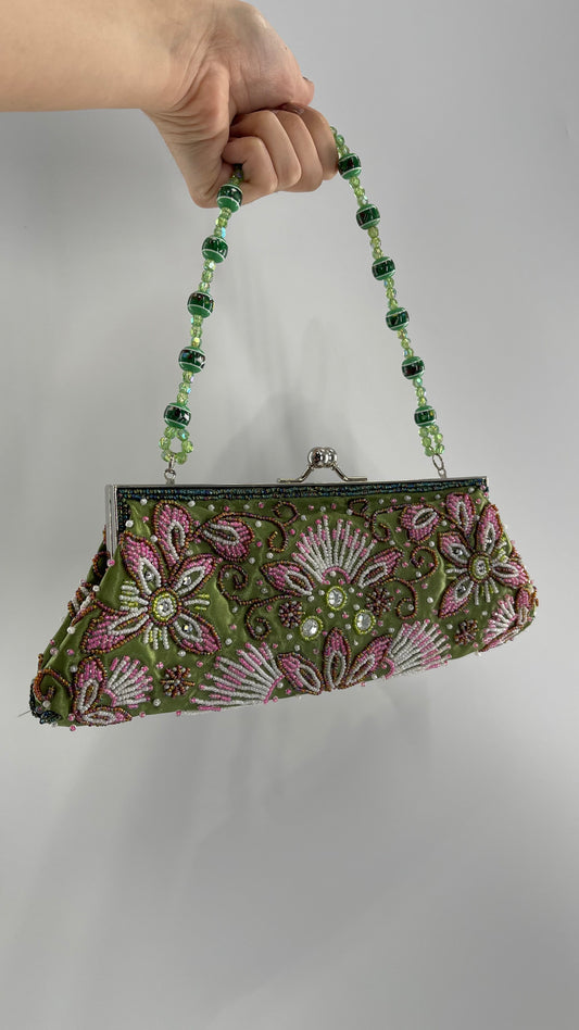 Vintage 1990s Fashion Express Beaded Green/Pink Purse