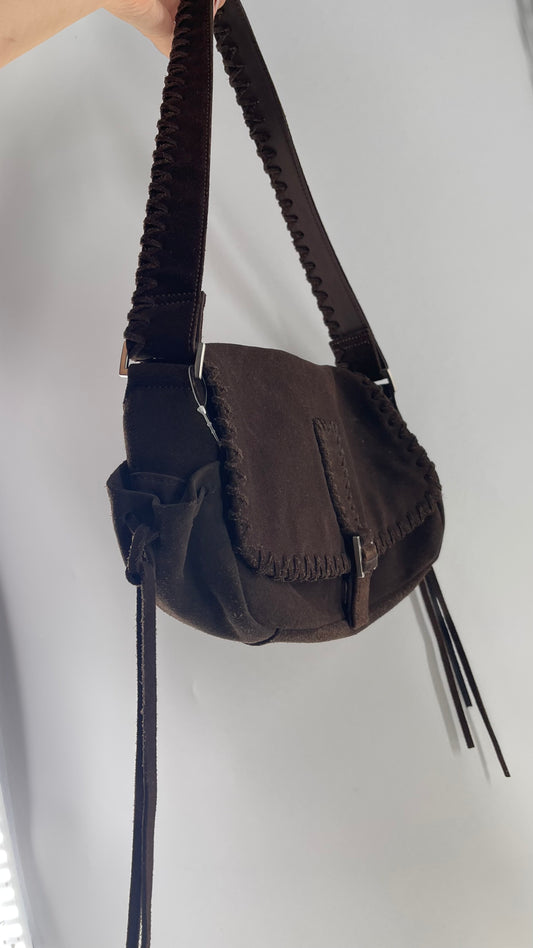 Vintage Brown Genuine Suede Leather Saddle Purse with Sewn Through Straps