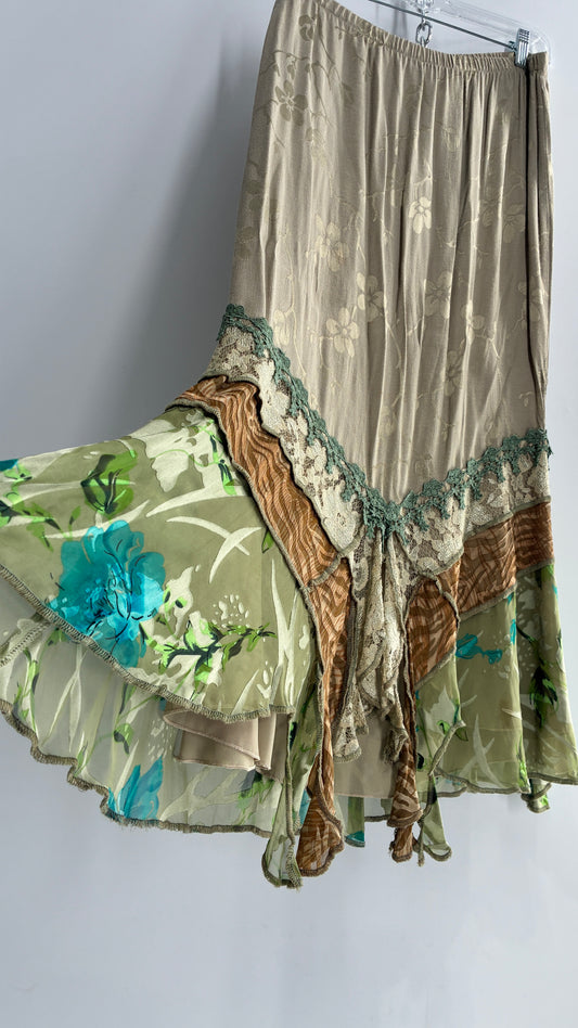 Vintage SPENCER ALEXIS Muted Green Full Skirt with Mixed Pattern Handkerchief Hem (Large)Preço normal $49.00Preço normalPreço unitário por$118.00Preço promocional $49.00Esgotado