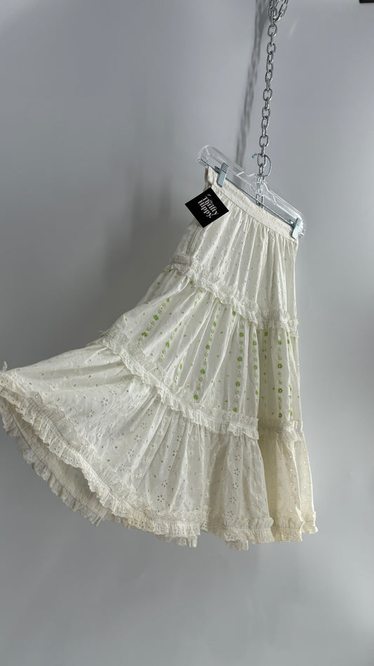 Vintage White Eyelet Lace Tiered Skirt with Ruffled Lace and Green Floral Embroidery (XS)Preço normal $32.00Preço normalPreço unitário por$55.00Preço promocional $32.00Promoção