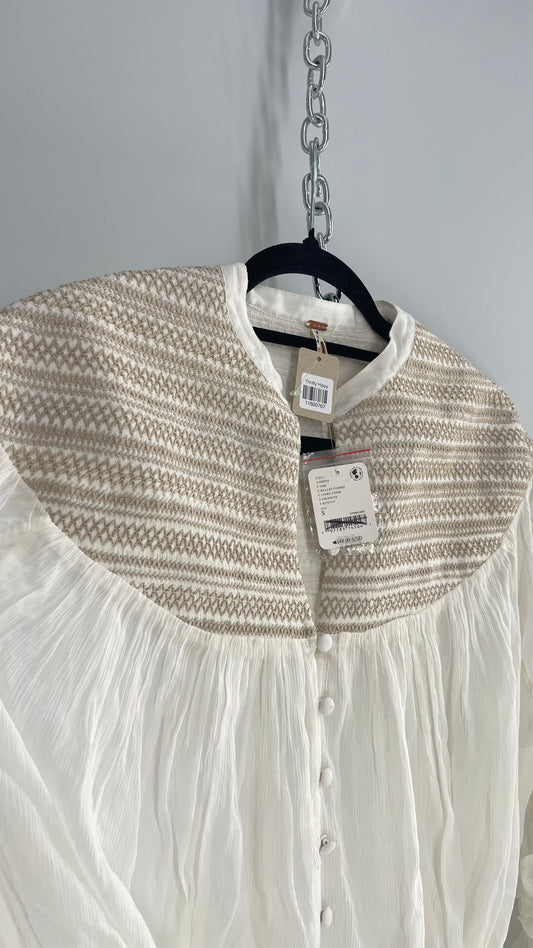 Free People Off White Draped Sleeve Button Front Embroidered Neckline Blouse with Tags Attached (Small)Preço normal $89.00Preço normalPreço unitário por$148.00Preço promocional $89.00Promoção
