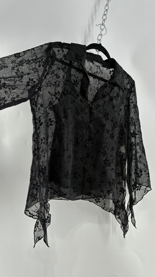 Vintage Black Handkerchief Hem Button Front Velvet Patterned Blouse (Medium)Preço normal $28.00Preço normalPreço unitário por$44.00Preço promocional $28.00Promoção