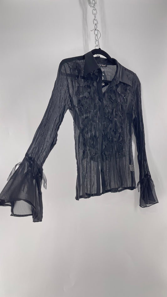 GREGE Vintage Black Crimped Button Front Blouse with Beaded Ruffled Bust (S)
