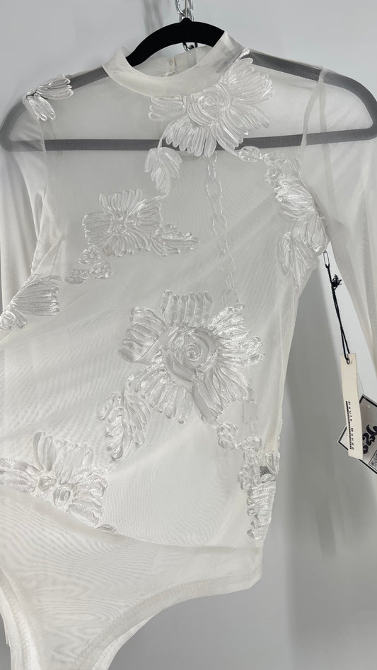 Haute Monde White Mesh Bodysuit with Ribbon Embroidery, Bell Sleeves and Tags (Small)